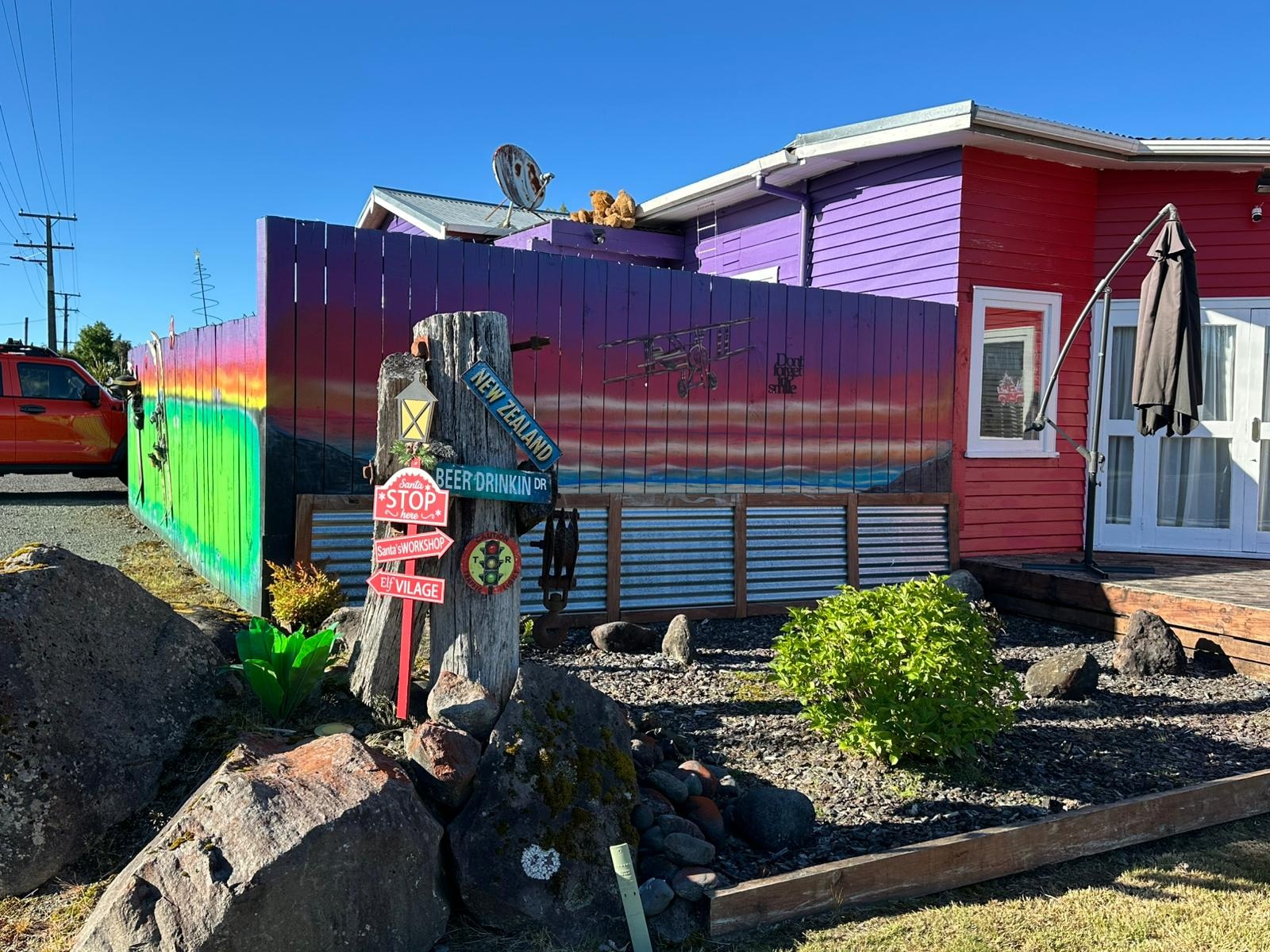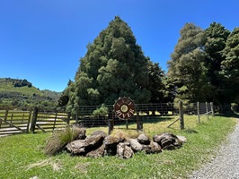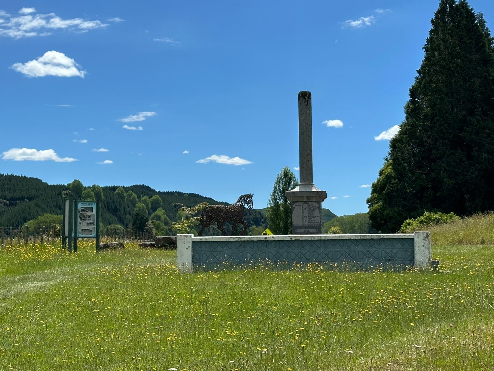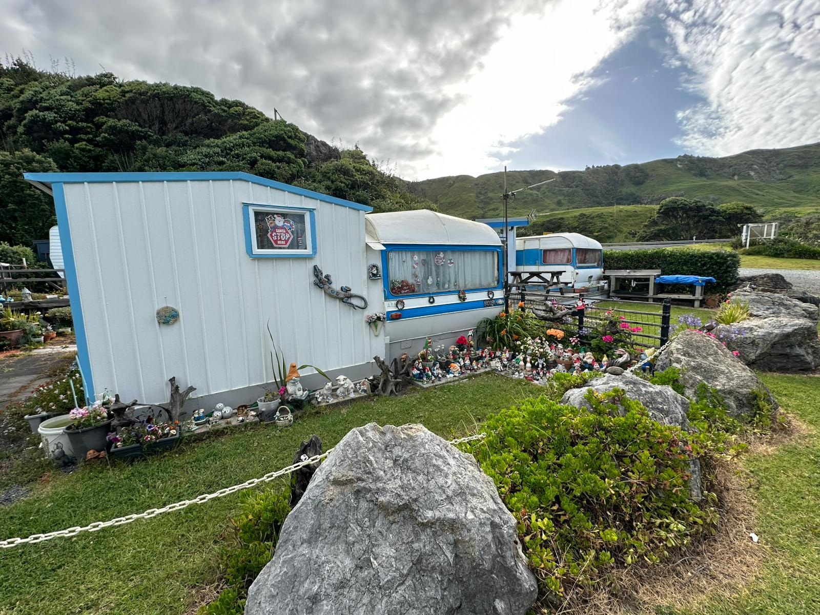 Endlich näherte sich mein Zeltplatz hinter dem Monument (Das Kaitīeke-Kriegsdenkmal wurde am 22. Januar 1923 enthüllt. Die Gedenkinschrift lautete: Dieses Denkmal wurde von den Siedlern von Kaitieke errichtet in Erinnerung an diejenigen, die ihr Leben gaben im Großen Europäischen Krieg 1914 - 1918. Die Namen von 23 einheimischen Männern sind aufgelistet), wo die Trailangel ihr Haus haben. Eine Garage dient als Anlaufstelle: mit Kühlschränken, Wasserkocher, Kaffeemaschine und Kleinigkeiten zum Kaufen, sogar Eis. Roger empfing mich und erzählte ohne Unterbrechung, worauf ich aber vorbereitet war. Als nette Geste bekam ich ein Badehandtuch und die zweite Nacht würde gratis sein.