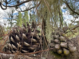Die Farnbäume sahen stellenweise wirklich witzig aus; ihr verwelktes Laub hing herunter, als hätten sie einen Rock an. Kohlbäume (als "Kohlbaum" wird die Keulenlilie Cordyline australis, eine robuste, palmenähnliche Pflanze mit Blattschöpfen, bezeichnet. Sie kann bis 12 Meter hoch werden) säumten meinen Weg, ihre langen Blätter lagen vertrocknet auf dem Boden. Rechts von mir war der Himmel blau, während links eine Wolke hing, die aussah wie ein UFO. Es war ein richtig angenehmer Weg und ich genoss jeden Schritt.