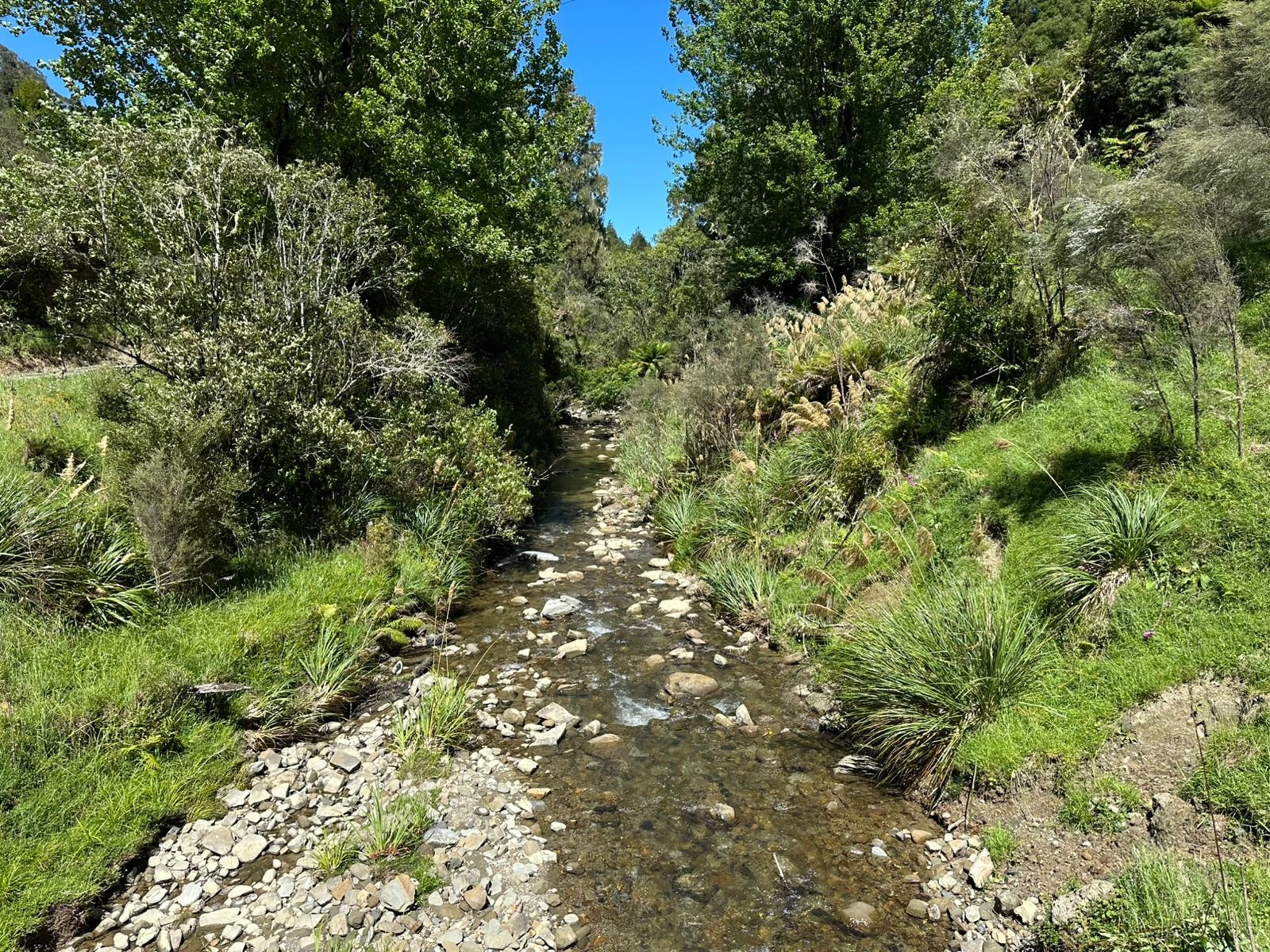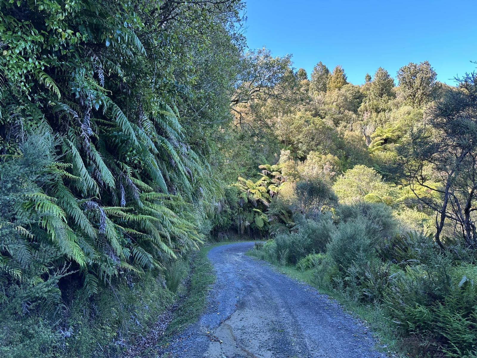 In aller Ruhe duschte ich, frühstückte und packte zusammen, bevor ich mich auf den Weg machte. Der Tag versprach, nicht sonderlich anstrengend zu werden, da es, abgesehen von einer winzigen anfänglichen Steigung, überwiegend bergab gehen sollte. Der Himmel war strahlend blau, und ich konnte noch einmal die großartige Aussicht auf die Vulkane genießen, bevor ich Waimarino hinter mir ließ. Der Weg führte mich dann auf einen Schotterweg, wo die Aussicht leider etwas spärlicher wurde.