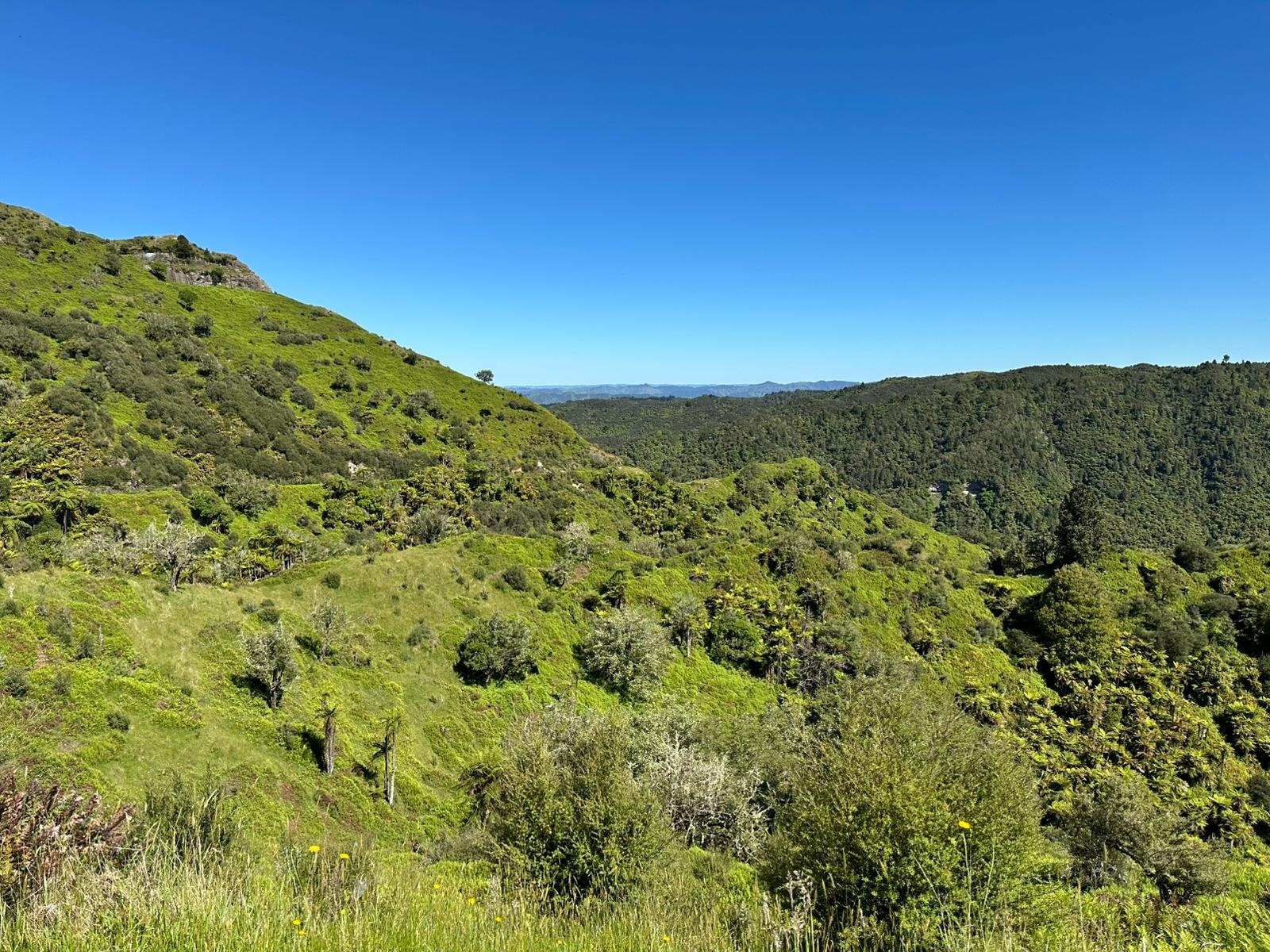 Doch dann erhaschte ich einen wunderbaren Blick ins Tal hinunter und sah sogar den Taranaki in der Ferne. Wenig später schlängelte sich ein Wiesenweg gemütlich nach unten mit herrlichen Blick ins Tal. Und dann hatte ich es geschafft: Ich knackte die 1.200 km Marke!