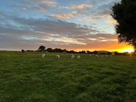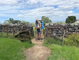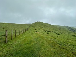 Rechts Schafweiden, links noch einmal ein Blick auf den One Tree Hill. Unten auf der Wiese habe ich gerade zum zweiten Mal heute einen Sittich gesehen und fotografiert, ein rotes Köpfchen – leider etwas unscharf. Vor lauter Sittichen bin ich die Wiese bis ganz unten gelaufen – die falsche Richtung! Aber dafür wartete Ken, der Kiwi, schon am Zaun. Auf ihn warte ich schon seit Tagen. Er ist der netteste Mensch, den ich bisher auf dem Trail getroffen habe.