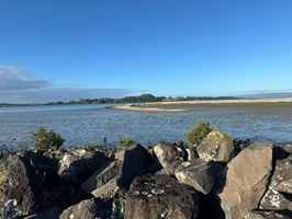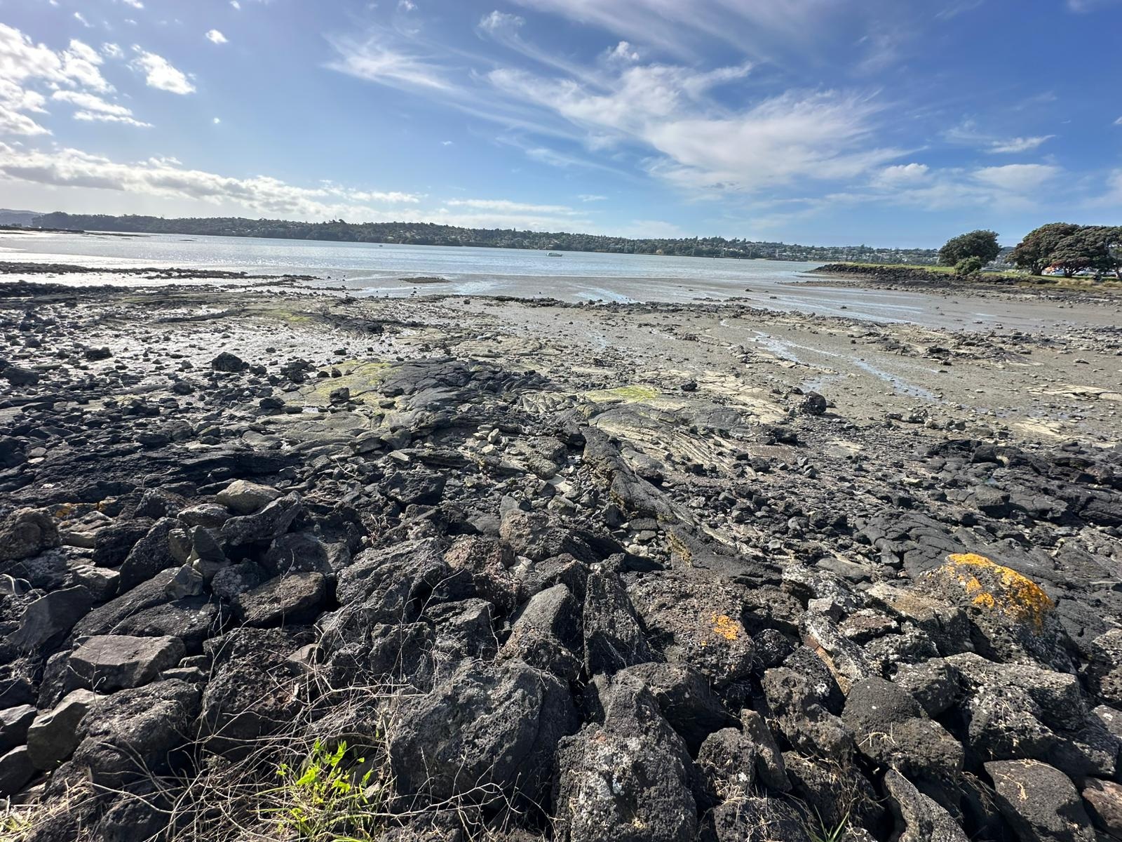Zwei Jungs kamen gerade vom Strand, mit 10-Liter-Eimern und Hammer bewaffnet. Sie haben Austern von den Steinen geschlagen. Leider sprachen sie kein Englisch. Der Esplanade Walk führte mich schließlich bis zur Campsite, wo ich heute zelten werde. Hier in dem Reservat sind viele Watvögel unterwegs. Die Lavaströme sind jetzt, bei Ebbe, sehr gut zu sehen.