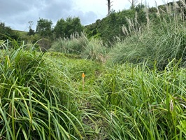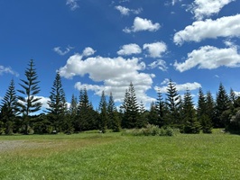 Auf den Wiesen standen jetzt überall Gruppen von Ti Kouka (Kohlbaum), was im hüfthohen Gras und mit dem Meer im Hintergrund toll aussah. Zurück auf der Straße fühlte ich mich mit dem vielen Verkehr und den nah vorbeirauschenden Autos nicht ganz wohl. Ich war froh, immer wieder auf den Seitenstreifen springen zu können, während die umliegende Industrie den Abschnitt auch nicht schöner machte.