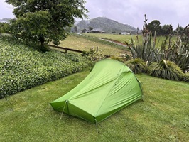 Sie haben mir angeboten, mit meinem Schlafsack drinnen zu schlafen, aber ich ziehe es vor, draußen zu bleiben. Ich liebe mein Zelt und bin froh, jetzt den Regen prasseln zu hören.