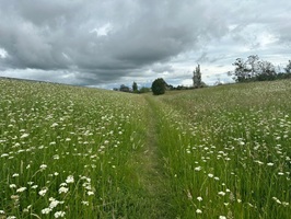 Dann der erste Rückschlag: Ich kam an einen Fluss, der nach der regenreichen Nacht so angeschwollen und breit war, dass an eine Überquerung nicht zu denken war. Das hieß: 2,8 km zurück in die entgegengesetzte Richtung bis zur Strasse und dort vorsichtig unter der Brücke durch und auf der anderen Seite zurück zum Trail zu gehen. Aber ein Pfad war nicht zu erkennen und das Gras dorthin hüfthoch. Ich entschied mich, endlich an der Brücke angekommen, schließlich für die Straße. Anfangs stark befahren und stressig, konnte ich zum Glück bald auf eine kleinere Straße ausweichen. Die lief ich dann mit deutlich besserer Laune. Allerdings nahm mir ein Farmer bei einer kurze Pause jede Hoffnung, früher wieder zum Trail zurückzukommen. Noch 5,9 km bis Mercer und er meinte, es gäbe keinen Weg, der früher auf den Trail zurück führt. Das hieß für mich, auf der Strasse weiterzulaufen.