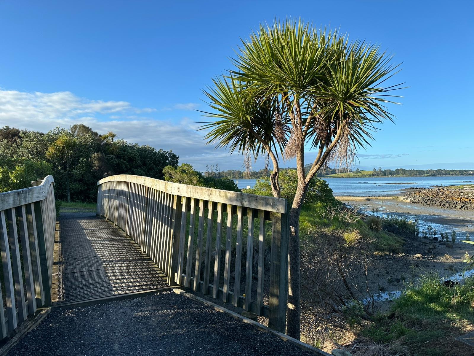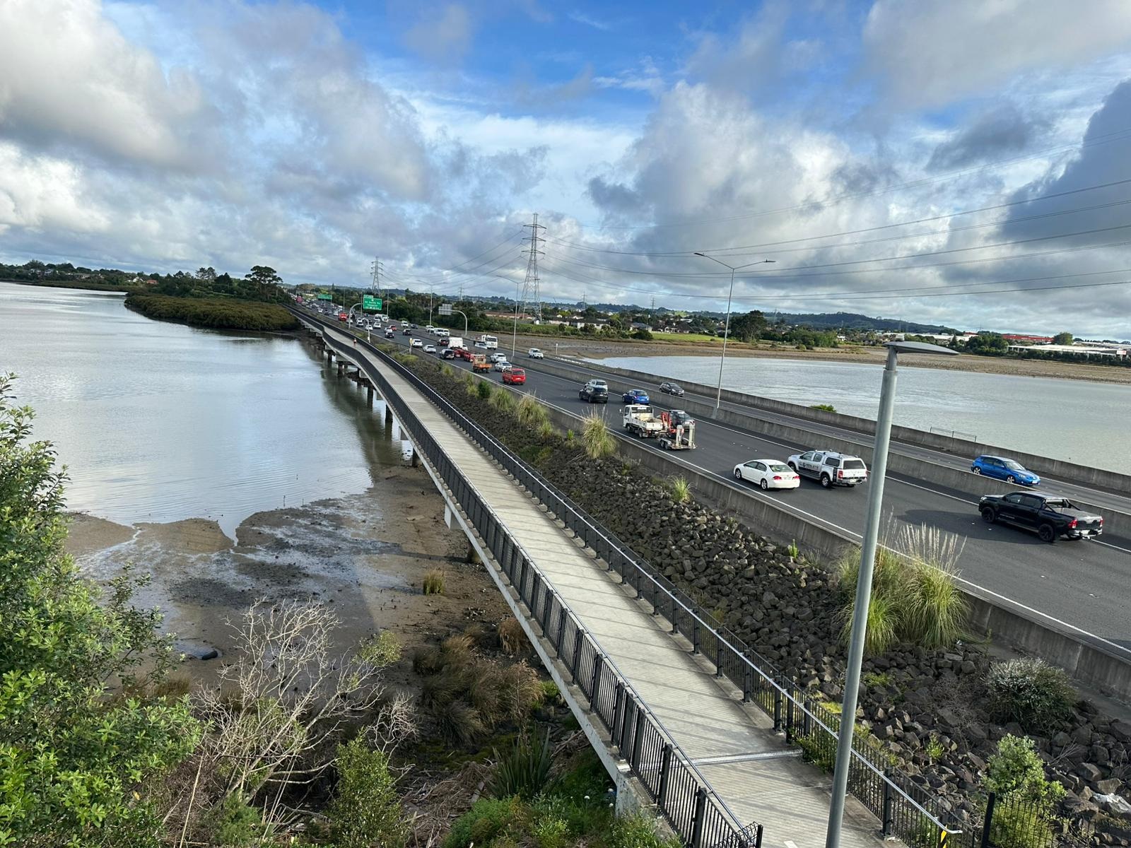 Anschließend hatte ich genug Unterhaltung mit David, dem Australier, mit dem ich ein Stück lief. Nach einer kleinen Pause erreichte ich das Puhinui Reserve, in dem ich aber schnell wieder draußen war. Ein Teich mit Palmen und Enten war vielversprechend, doch schon führte mein Weg über eine Weide und dann tauchte erneut Industrie auf. Schließlich landete ich mitten im Industriegebiet mit sechs Fahrstreifen und unruhigem Verkehr. Der lange Arm der Großstadt Auckland reicht bis zur Vorortstadt Manukau. Erst danach wir der Te Araroa wieder das, was er sein soll: ein Wildnis- und Naturwanderweg.