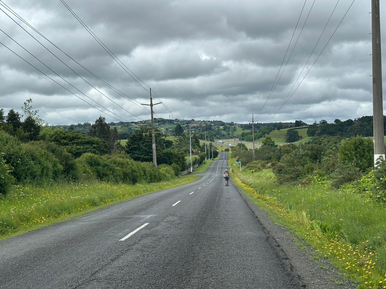„Endlich“ kam noch mal ein Anstieg. Ich machte unten eine kurze Pause und ging die paar hundert Meter Höhenanstieg ganz langsam an. Es war noch früh und ich hoffte, der Regen würde ausbleiben. Während meiner Pause am Straßenrand hielt sogar ein Auto an, um zu fragen, ob ich Hilfe brauchte. Das ist hier in Neuseeland wirklich super, die meisten sind sehr freundlich und sehr, sehr hilfsbereit.