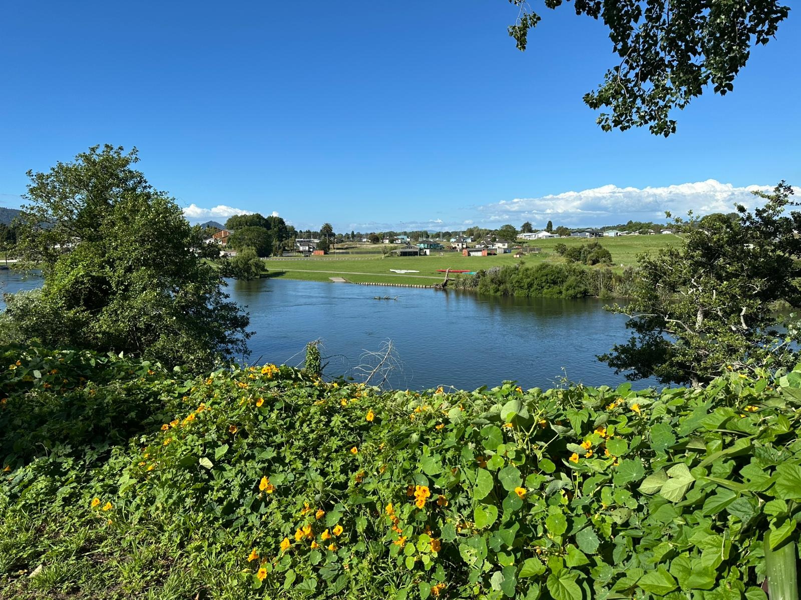 Die letzten 16 km bis nach Rangiriri führten auf einem Wiesenstreifen neben dem Highway entlang. Der Autolärm störte mich mit der schönen Blumenwiese nebendran kaum noch, auch nicht das ein Meter hohe Pampasgras gelegentlich. Ich sah Ruderer auf dem Fluss und ein kleiner roter Schmetterling fesselte eine Moment lang meine Aufmerksamkeit – es blieb abwechslungsreich.Da die 36 km Wegstrecke plus Umweg heute unmöglich zu schaffen waren, suchte ich mir schließlich einen Zeltplatz am nun sehr breiten Waikato River, umgeben von Bäumen und Wiesen.