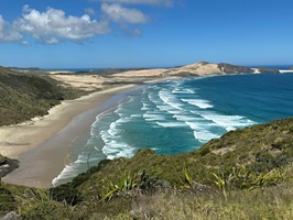 Der Start des Te Araroa am Cape Reinga Lighthouse ist ein beeindruckendes Erlebnis. Hier treffen Tasmanische See und Pazifischer Ozean aufeinandertreffen. Die erste Sektion führt über den 90 Mile Beach (Te Oneroa-a-Tōhē), einem etwa 100 Kilometer langen Marsch. Die Wanderung beginnt mit Küstenpfaden und Dünenüberquerungen, bevor sie in einen kräfteraubenden und exponierten Strandmarsch übergeht. Die größte Herausforderung ist das Gehen auf weichem Sand, wobei Wanderer gut beraten sind, den Gezeitenkalender zu beachten, um bei Ebbe auf dem festeren, wassernahen Sandstreifen laufen zu können. Die weite, spektakuläre Landschaft mit riesigen Sanddünen und endlosen Ausblicken aufs Meer ist landschaftlich atemberaubend, erfordert aber Durchhaltevermögen. Daher ist dieser erste Teilabschnitt eine sofortige und intensive physische und mentale Herausforderung, die Wanderer ideal auf den langen Weg nach Süden einstimmt. Die Wasserversorgung erfolgt in den eingerichteten Campsites (Twilight Beach Campsite, Maunganaui Bluff Campsite, Utea Park oder Hukatere Lodge Camp). |