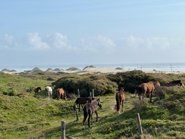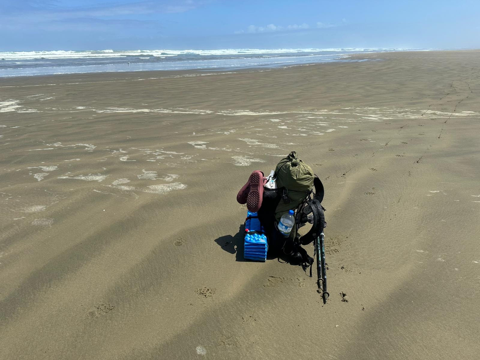 Der Tag begann bedeckt, später setzte sich die Sonne durch. Die Landschaft war wenig abwechslungsreich, und der Sand wechselte ständig zwischen hart und weich, was die Strecke konstant anstrengend machte. Ich bin bisher glücklicherweise blasenfrei, obwohl viele andere Wanderer nicht so viel Glück haben. Heute musste sich sogar jemand mit Achillessehnenproblemen vom Strand abholen lassen.