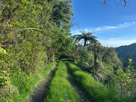 Nach dem Kahlschlag ging es wieder durch ein Gebiet mit Palmen und Farnen. Ich passierte ein kurzes, aber anstrengendes Waldstück mit matschigem, rutschigem Untergrund. Dann kam ich auf einen schmalen Wiesenpfad, von dem ich die wunderschöne hügelige Landschaft überblicken konnte. Kurz darauf war ich schon wieder in einem Wäldchen mit lehmigem, rutschigem, matschigem Boden. Dieser ständige Wechsel heute war unglaublich: Wald, Straße, Splitt, Matsch…!