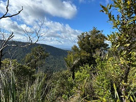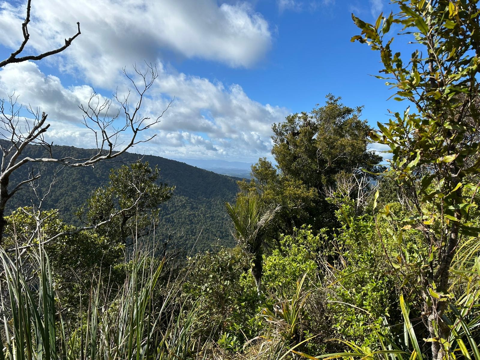 Um 7:30 Uhr ging es nahe des Pakiri Beach los. Wir hatten etwa zehn Stunden veranschlagt und die haben wir auch gebraucht. Allein für das erste Waldstück brauchten wir drei Stunden, es war ein ständiges Rauf und Runter. Wir machten eine kurze Pause an einem Hubschrauberlandeplatz und hatten sogar ein paar flüchtige Ausblicke auf die Küste. Die Wolken waren aber so schnell, dass man das Panorama wirklich nur kurz genießen konnte.