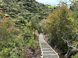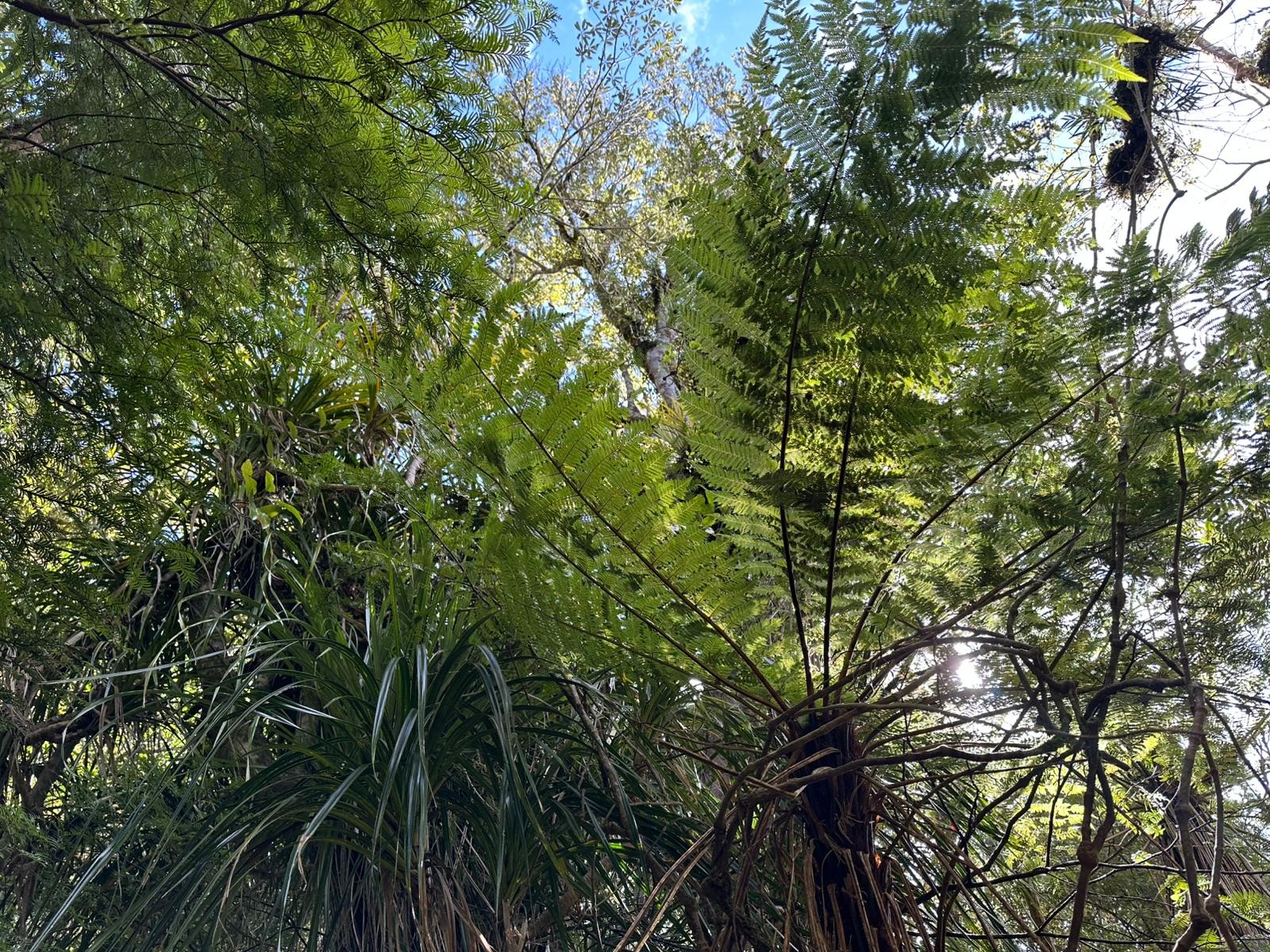 Der breite Weg wich dann aber doch einem schmalen Pfad. Es folgte ein kurzes, steiles Stück bergauf, bevor es direkt wieder bergab ging. Die Sonne schien, und die Regentropfen glitzerten an den Palmen und Farnen. Der viele Regen hatte den Boden ziemlich aufgeweicht, aber ich konnte ohne Probleme laufen. Meine feuchten Klamotten trockneten schnell, nur die Schuhe blieben nass – daran wird sich wohl auch nichts ändern, bis ich in Auckland neue kaufe. Die erste Garnitur ist langsam durch und ausgenudelt. Immer wieder boten sich mir atemberaubenden Ausblicke in die Landschaft - eingerahmt von Farnen, wie durch einen Bilderrahmen.