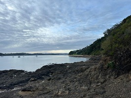 Anmerkung: Der Okura River fließt am Dacre Point ins Meer und die Querung des Flußbettes ist ausschließlich bei Ebbe möglich. Dennoch kann je nach Wetter der verbleibende Wasserpegel über einen Meter hoch sein - im optimalen Fall und bei Querung an der empfohlenen Stelle sind es dennoch etwa 45 cm.