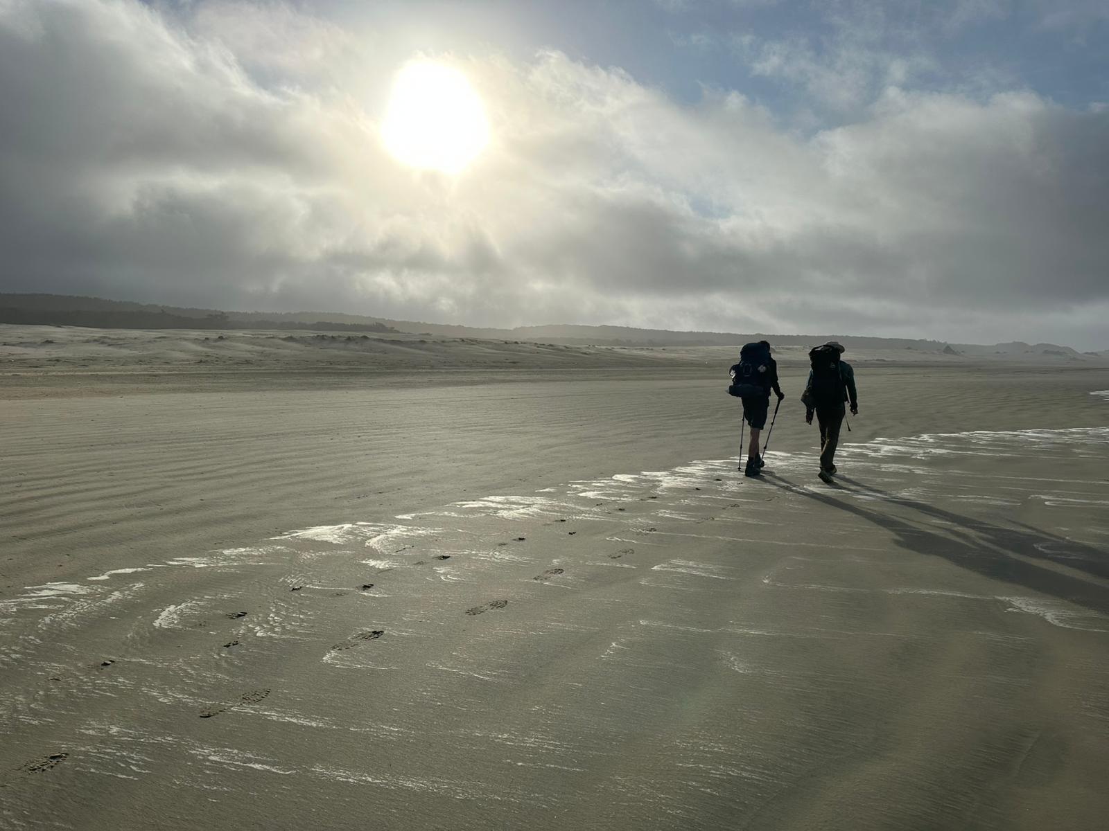 Als ich in einen Kiefernwald eintauchte, erhaschte ich schon von Weitem einen ersten Blick auf das Meer. Kurz darauf traf ich auf die anderen Wanderer unserer Gruppe, die gestern eine beachtliche Strecke von 36 Kilometern zurückgelegt hatten, um wieder aufzuschließen. Schwupps, und schon standen wir wieder am Strand, der, wie so oft auf diesem Trail, einfach einmalig war. Das Wasser reichte noch ziemlich hoch und meine Füße wurden schnell nass – aber das war ich ja inzwischen gewohnt und es machte mir absolut nichts mehr aus. Ein schöner Anblick waren die Seevögel, die sich auf einer Sandbank in der Sonne räkelten.