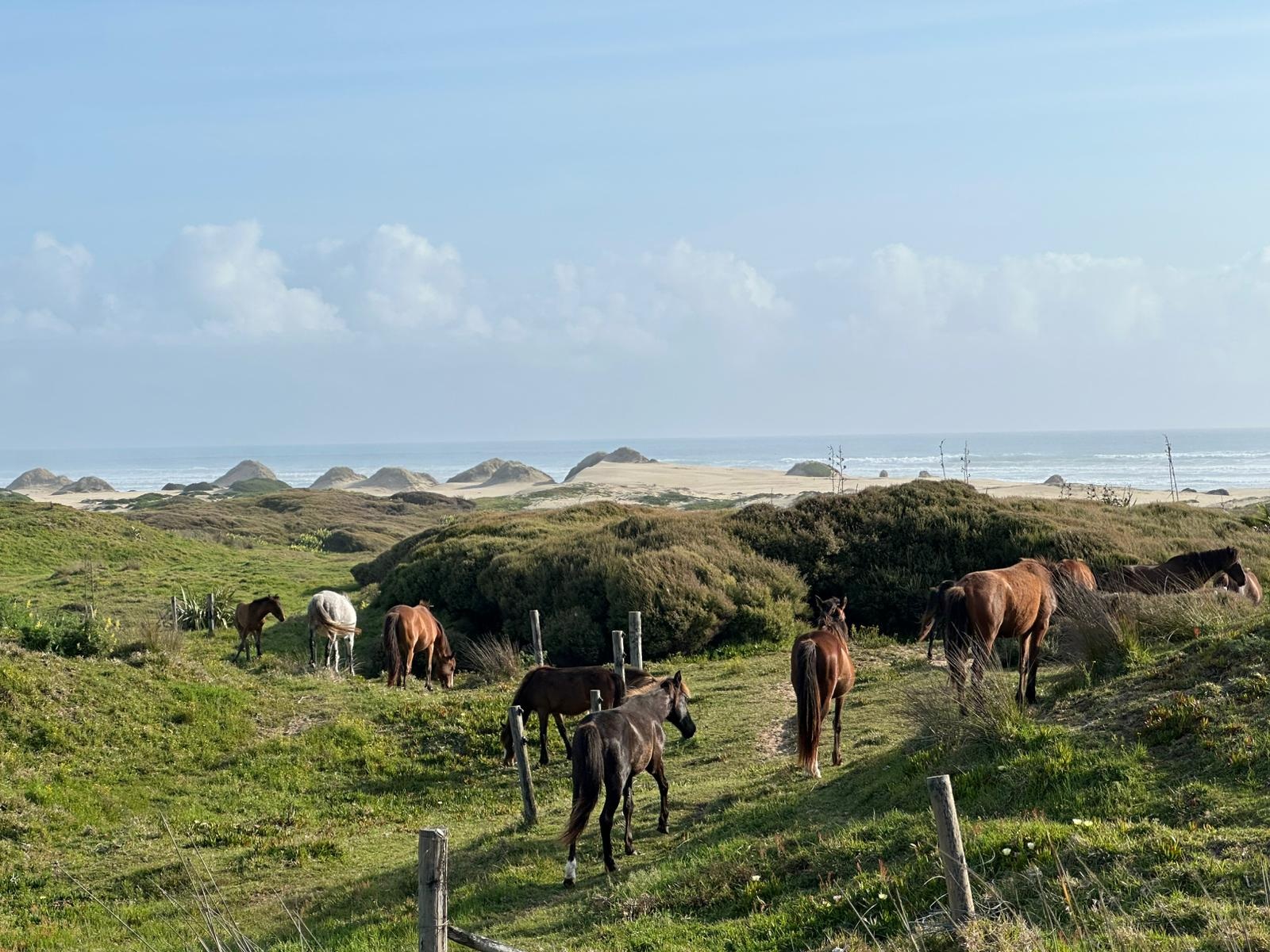 Nach 100 km einen endlos werdenden Sandstrand entlang ist mit diesem Abschnitt endgültig Schluß! Die Landschaft wechselte nach dem großen Campingplatz abrupt von Sand zu weiten Weideflächen und Buschhecken.