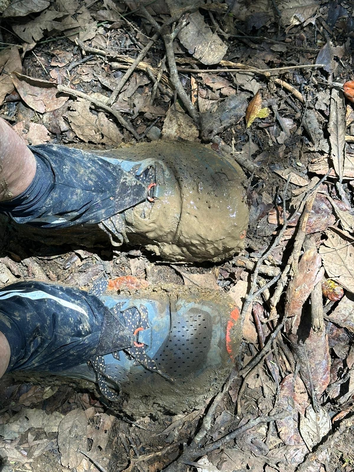 Danach ging es richtig los: Alles war rutschig, matschig, steil rauf und runter. Regina und Tino träumten schon von Lasagne, Pizza und Bier. Ich betonte zwar immer wieder, dass es nicht mehr weit sei – war es aber! Der Wald an sich war wunderschön, fast wie ein Urwald. Mystisch bei dem feuchten Wetter, das die Pflanzen, Moose und Flechten sichtlich lieben. Man sah kaum Spuren menschlichen Eingreifens. Ein kleiner Fluss schlängelte sich neben unserem immer schmaler werdenden Pfad. Als wir ihn durchqueren mussten, war es eine willkommene Gelegenheit, die total matschigen Schuhe und Socken abzuspülen.