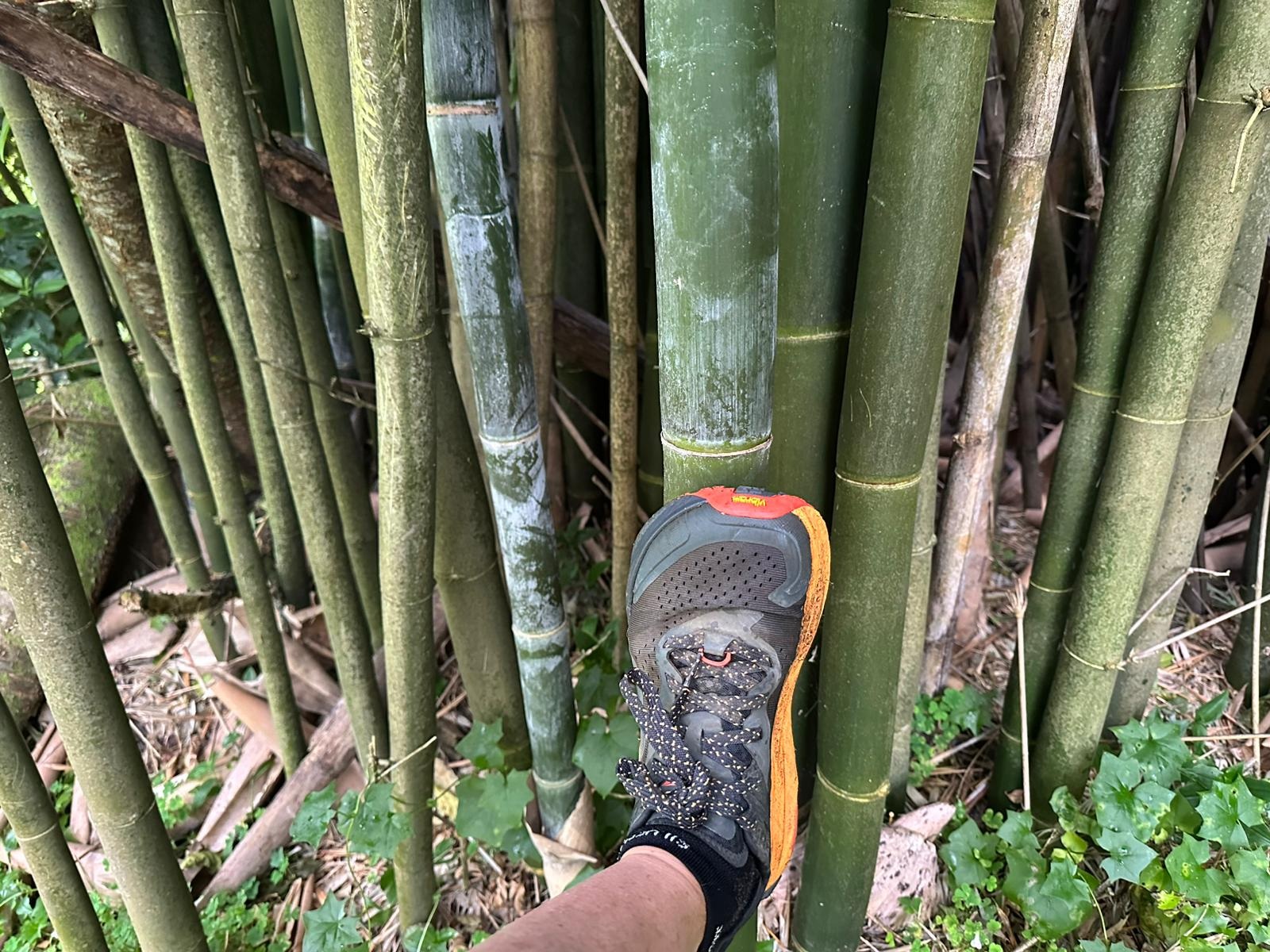 Trotzdem war ich froh, als ich auf eine Gravel Road abbog, die mich weg vom Asphalt führte. Die Landschaft wandelte sich in sanftes Weideland, bevölkert von Rindern und sogar Truthähnen mit ihren Küken. Ein besonders beeindruckendes Bild bot sich mir, als ich an einer schier endlos langen und wahnsinnig hohen Bambushecke vorbeilief. Die Sonne strahlte, ein leichter Wind wehte – perfekt für eine kleine Pause, die ich mir gönnte.
