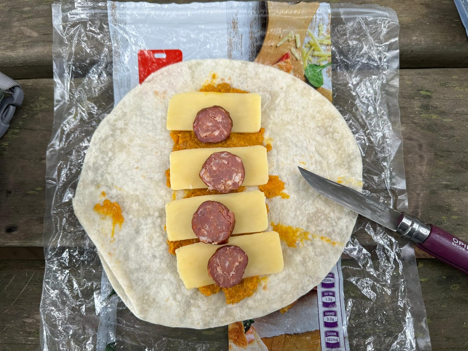 Nach dem Waldstück kam erfreulicherweise ein Stück Straße und ich war richtig dankbar dafür – das Laufen durch den feuchten Wald war nämlich superanstrengend. Vor dem zweiten Waldstück gab es eine schnelle Mittagspause: ein Wrap mit Käse und Mayo.