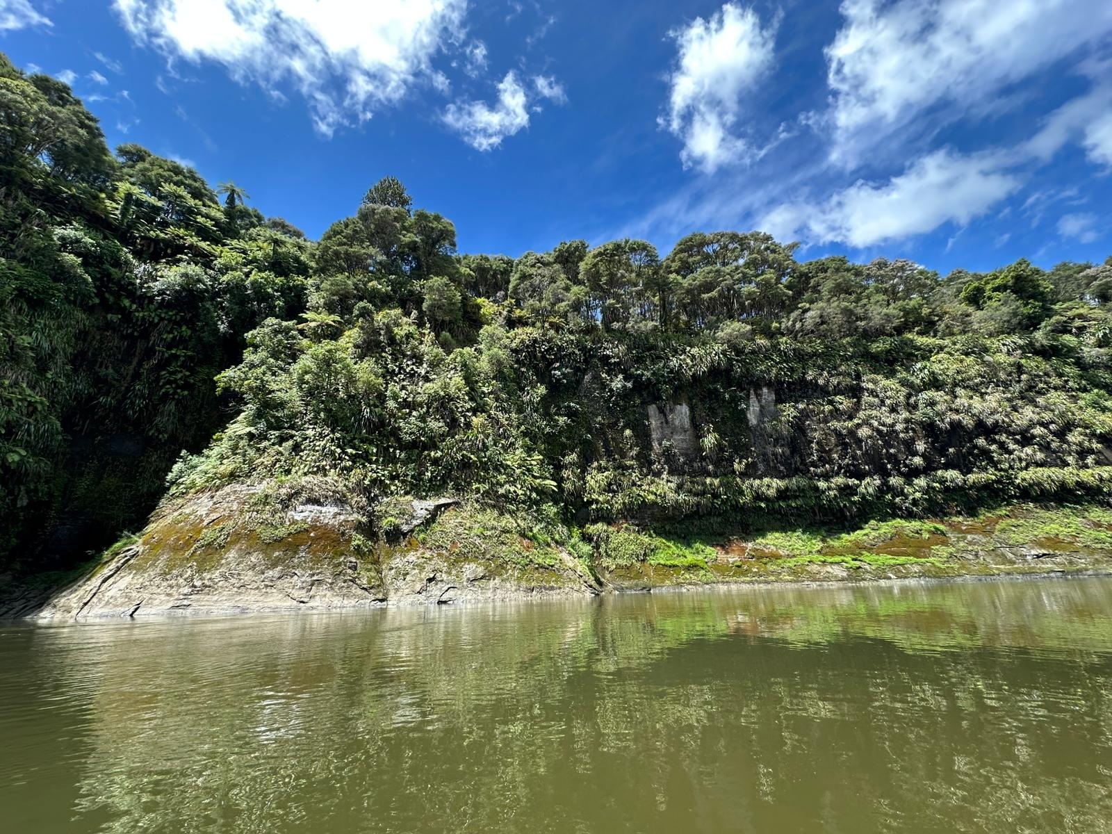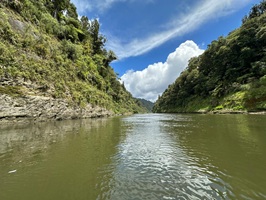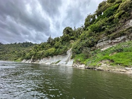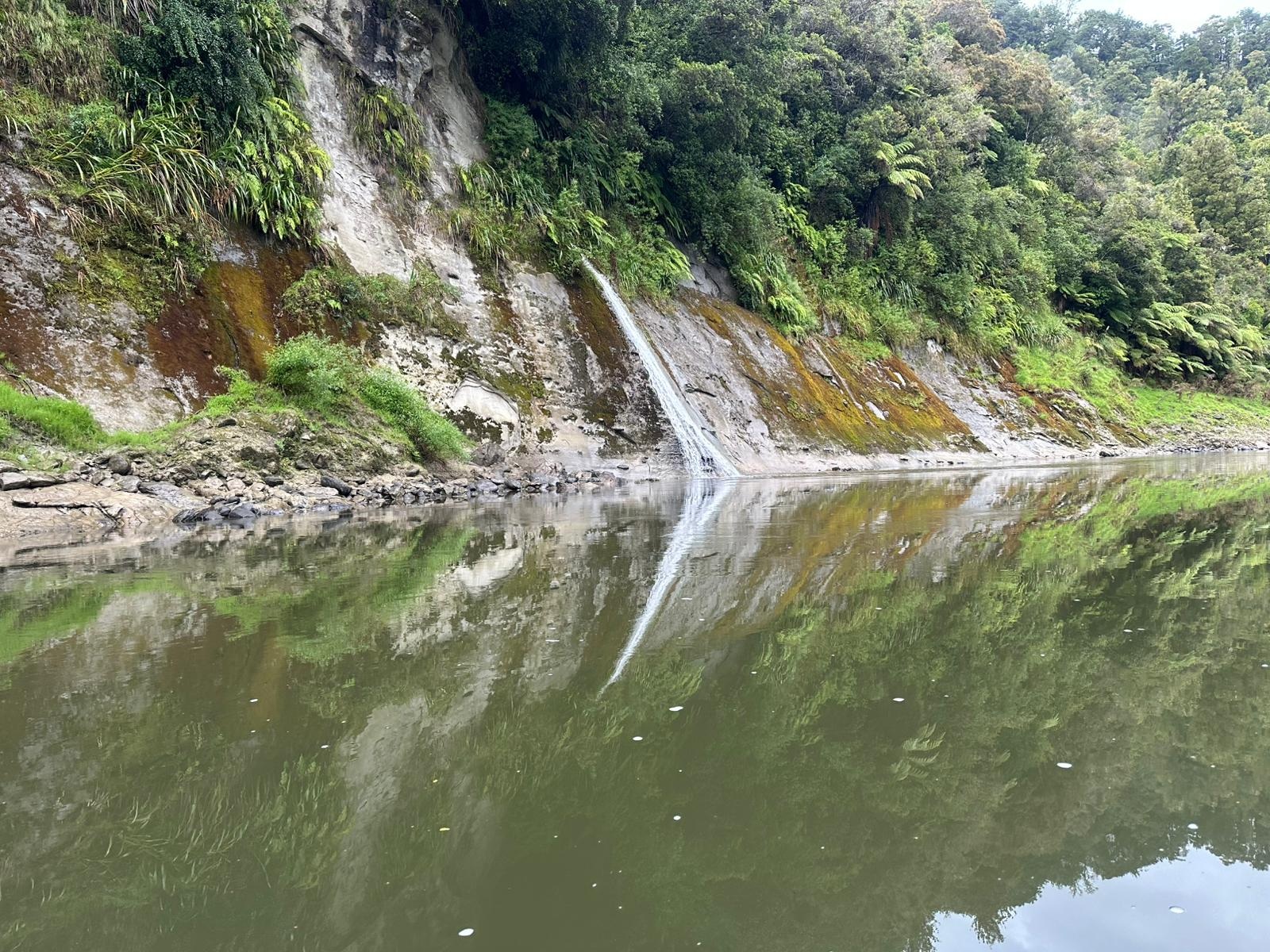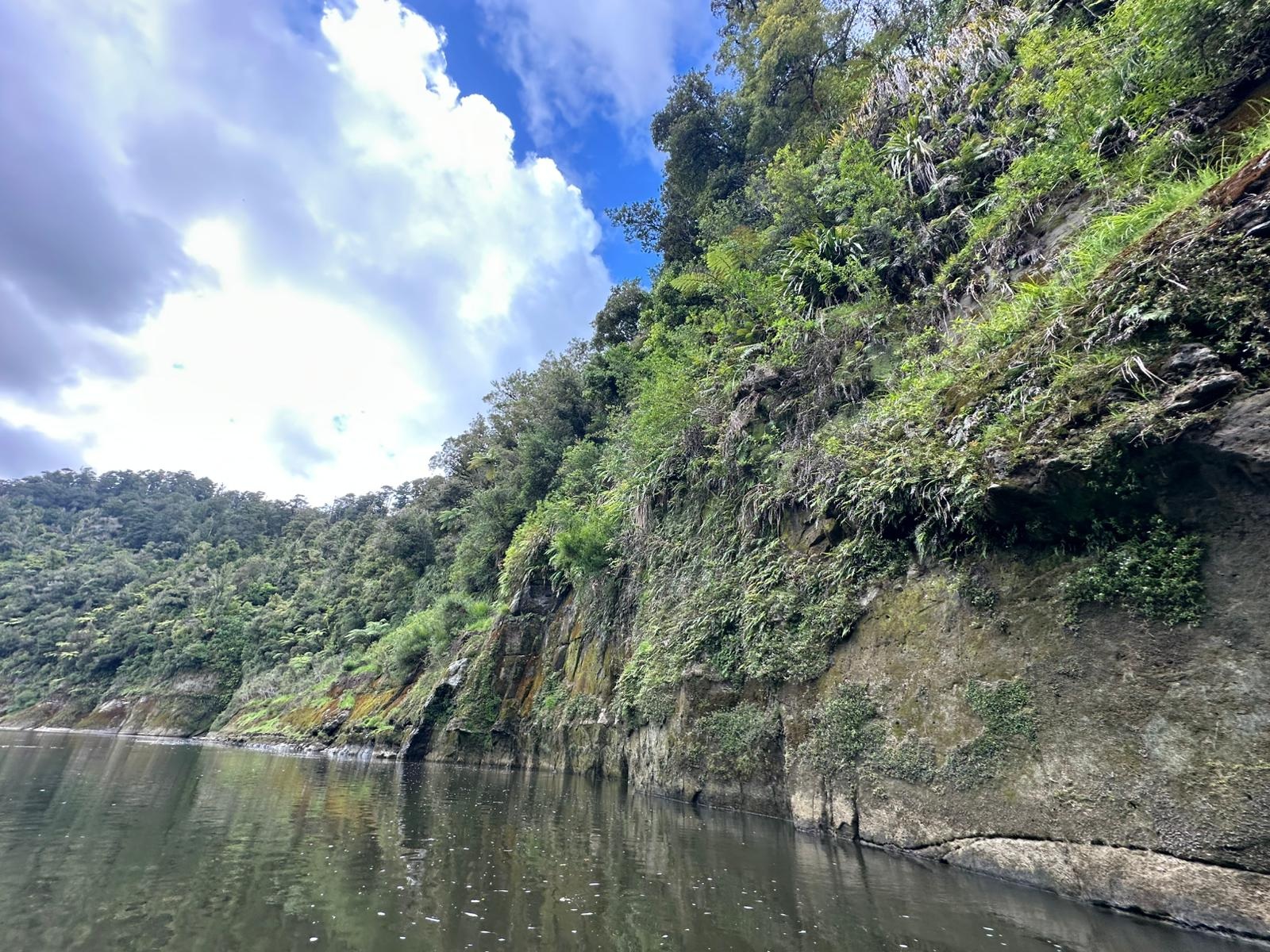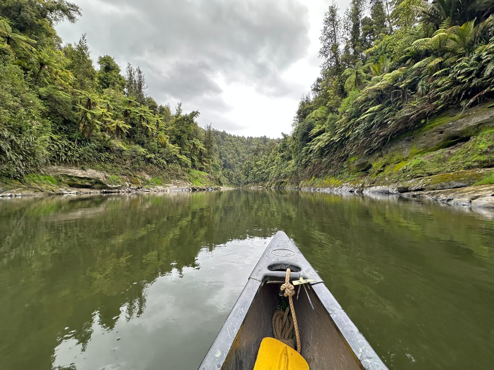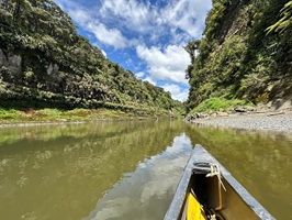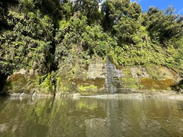 Die Fahrt gestaltete sich von Beginn an als ein freudiges Abenteuer, bei dem Guido das Kanu als geschickter Kapitän sicher durch die ersten schnellen Passagen steuerte. Selbst als wir uns einmal drehten und eine Stromschnelle rückwärts durchfuhren, behielten wir die Oberhand und blieben trocken. Die Umgebung, durch die wir geglitten sind, wirkt wie aus einer anderen Welt. Geologisch ist der Whanganui River tief in weiches Sedimentgestein, den sogenannten Mudstone oder „Papa“, eingeschnitten, was die Entstehung der beeindruckenden, steilen Felswände ermöglichte. Diese Wände waren über und über mit Moos, Farnen und majestätischen Farnbäumen bewachsen, während zahllose Wasserfälle in die Tiefe stürzten. In dieser abgeschiedenen Wildnis, die vor allem durch dichten Regenwald geprägt ist, konnten wir etliche Ziegen beobachten, die sich an den steilen Hängen tummelten. Besonders die Vogelwelt ist hier einzigartig, wobei der Fluss oft vom Ruf des Tui oder des neuseeländischen Fächerschwanzes widerhallt.