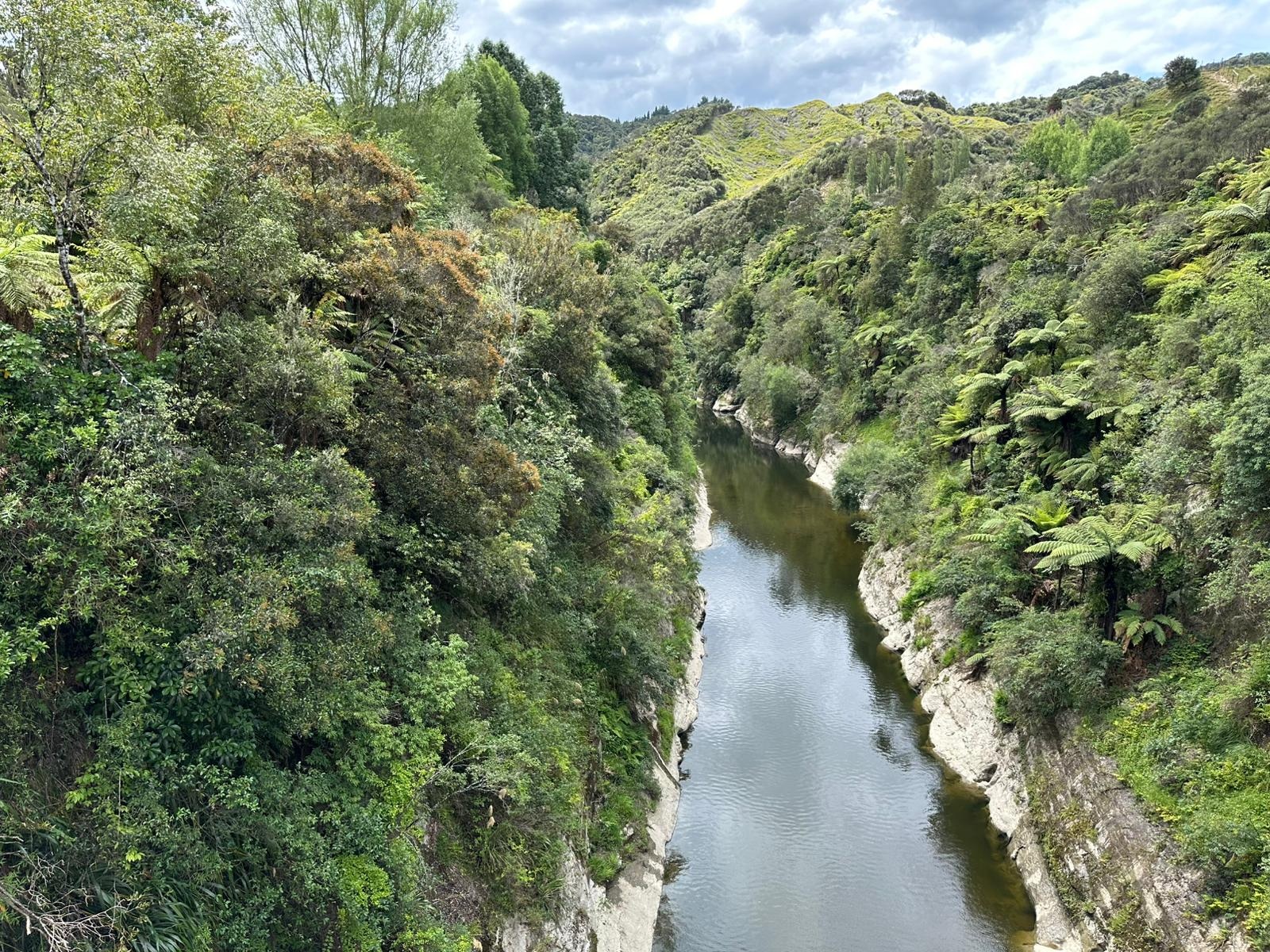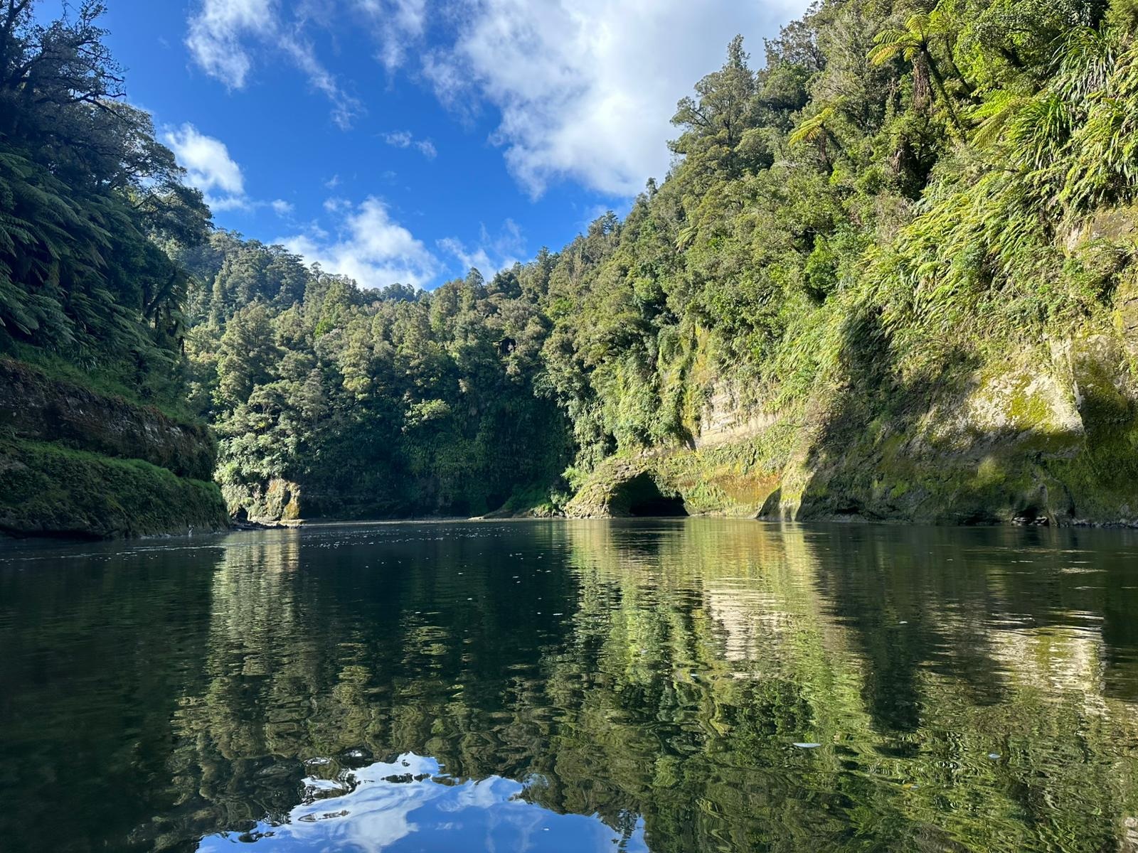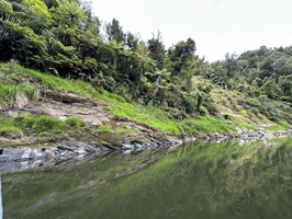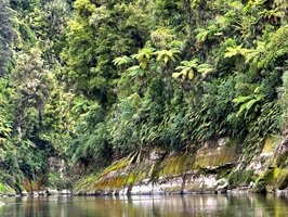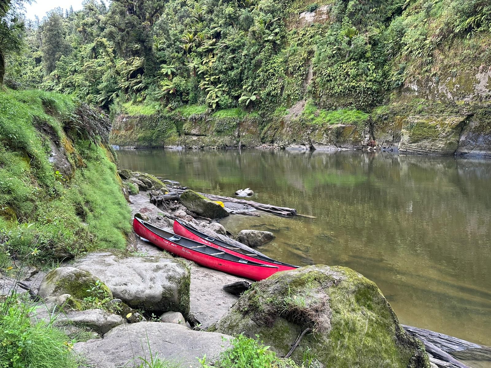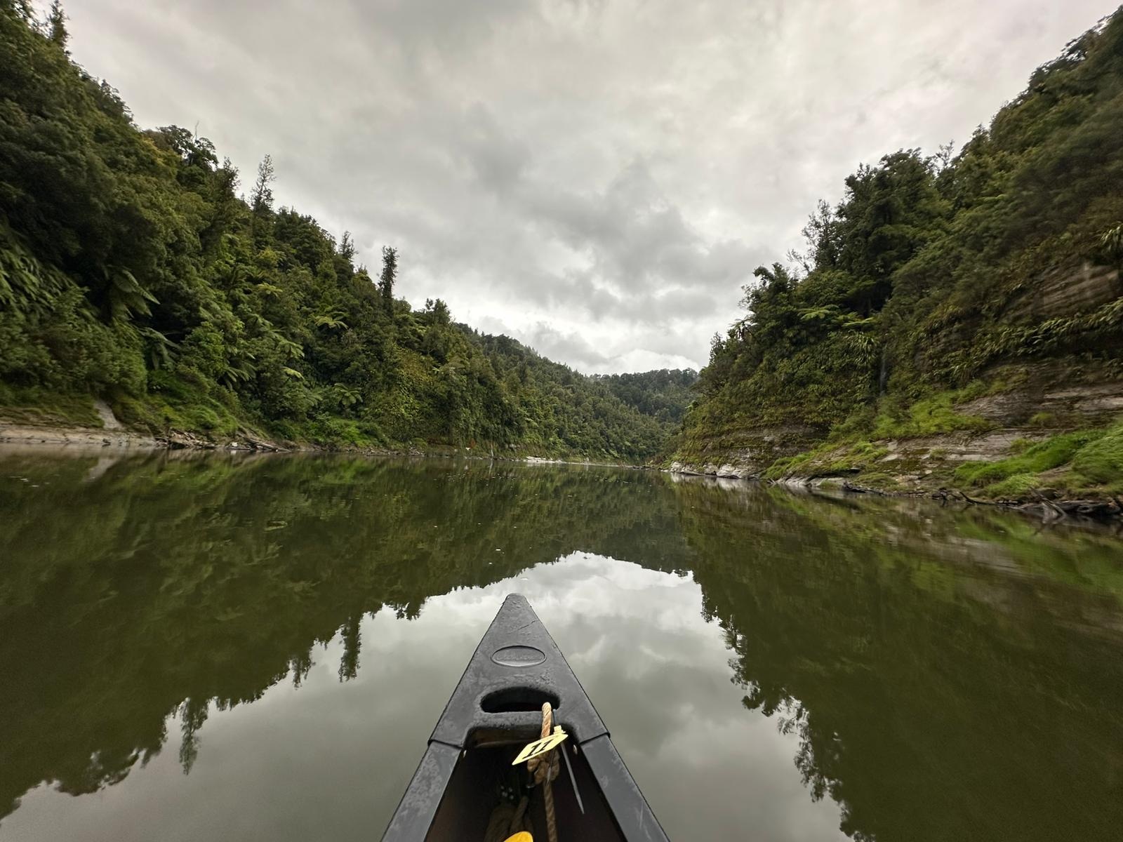 Die Fahrt gestaltete sich von Beginn an als ein freudiges Abenteuer, bei dem Guido das Kanu als geschickter Kapitän sicher durch die ersten schnellen Passagen steuerte. Selbst als wir uns einmal drehten und eine Stromschnelle rückwärts durchfuhren, behielten wir die Oberhand und blieben trocken. Die Umgebung, durch die wir geglitten sind, wirkt wie aus einer anderen Welt. Geologisch ist der Whanganui River tief in weiches Sedimentgestein, den sogenannten Mudstone oder „Papa“, eingeschnitten, was die Entstehung der beeindruckenden, steilen Felswände ermöglichte. Diese Wände waren über und über mit Moos, Farnen und majestätischen Farnbäumen bewachsen, während zahllose Wasserfälle in die Tiefe stürzten. In dieser abgeschiedenen Wildnis, die vor allem durch dichten Regenwald geprägt ist, konnten wir etliche Ziegen beobachten, die sich an den steilen Hängen tummelten. Besonders die Vogelwelt ist hier einzigartig, wobei der Fluss oft vom Ruf des Tui oder des neuseeländischen Fächerschwanzes widerhallt.
