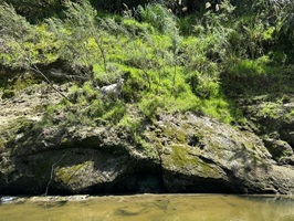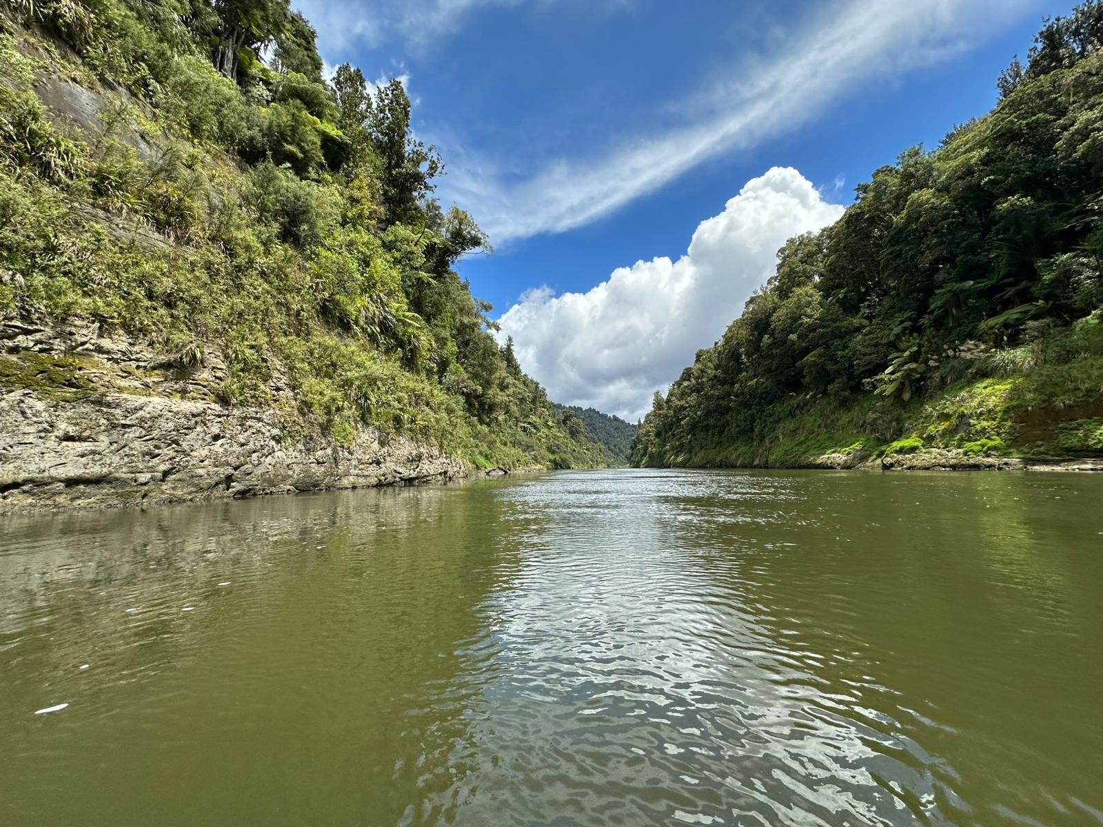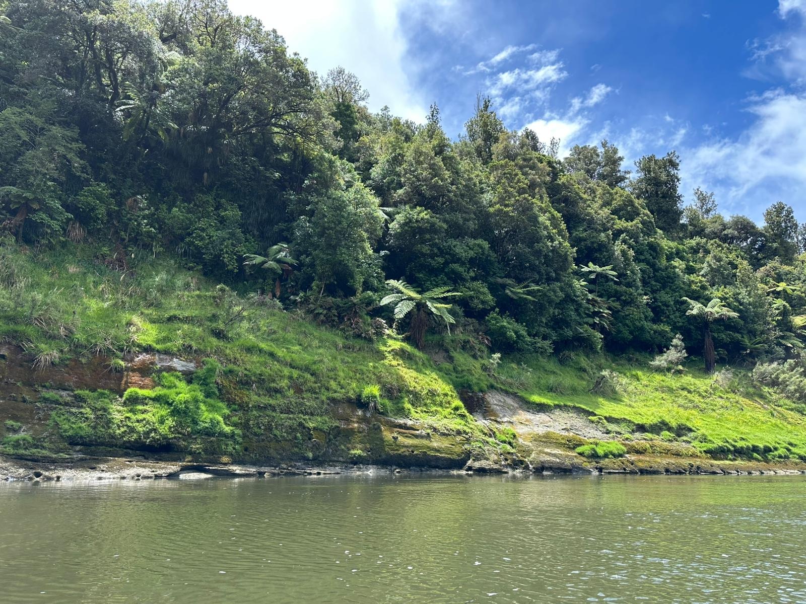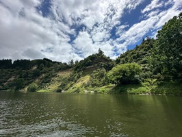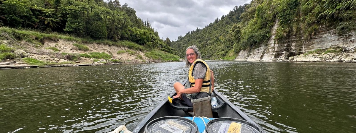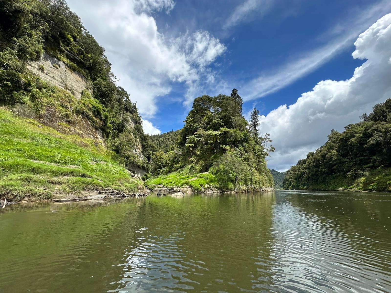 Die Fahrt gestaltete sich von Beginn an als ein freudiges Abenteuer, bei dem Guido das Kanu als geschickter Kapitän sicher durch die ersten schnellen Passagen steuerte. Selbst als wir uns einmal drehten und eine Stromschnelle rückwärts durchfuhren, behielten wir die Oberhand und blieben trocken. Die Umgebung, durch die wir geglitten sind, wirkt wie aus einer anderen Welt. Geologisch ist der Whanganui River tief in weiches Sedimentgestein, den sogenannten Mudstone oder „Papa“, eingeschnitten, was die Entstehung der beeindruckenden, steilen Felswände ermöglichte. Diese Wände waren über und über mit Moos, Farnen und majestätischen Farnbäumen bewachsen, während zahllose Wasserfälle in die Tiefe stürzten. In dieser abgeschiedenen Wildnis, die vor allem durch dichten Regenwald geprägt ist, konnten wir etliche Ziegen beobachten, die sich an den steilen Hängen tummelten. Besonders die Vogelwelt ist hier einzigartig, wobei der Fluss oft vom Ruf des Tui oder des neuseeländischen Fächerschwanzes widerhallt.