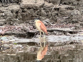 Die Fahrt auf dem Fluss war eigentlich sehr entspannt, da wir nur 24 Kilometer vor uns hatten. Die Stromschnellen stellten heute keine große Herausforderung dar, allerdings machten uns die Strömung und der Gegenwind ein wenig zu schaffen. Unterwegs begleiteten uns die Rufe zahlreicher Pfaue, von denen wir jedoch nur einen einzigen zu Gesicht bekamen. Besonders spannend war die Sichtung eines Vogels, den wir beide noch nie zuvor gesehen hatten. Am Ufer beobachteten wir zudem Schafe, Rinder und die allgegenwärtigen Ziegen.