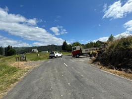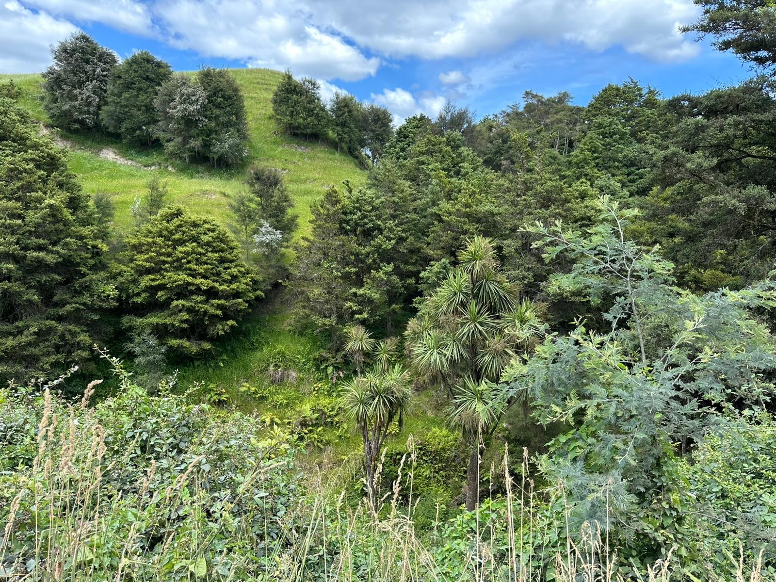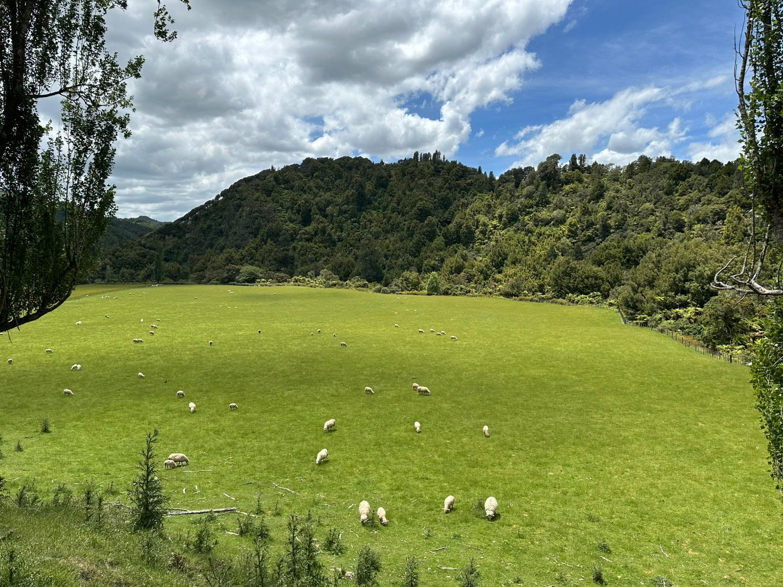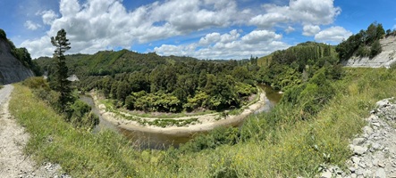 An einer Stelle wurde gerade der Straßenbelag erneuert. Die freundlichen Arbeiter fuhren mich das kurze Stück im Auto mit, da ich dort nicht laufen durfte. Sie boten mir noch Wasser an, aber ich hatte genug und so ging es bald zu Fuß weiter. Den ganzen Tag über wurde ich vom Retaruke River begleitet. Es gab immer wieder schöne Ausblicke auf den Fluss. Es war heute ein ganz gemütlicher Wandertag. Merk-würdig war eine Rasenfläche am Weg,die aussah wie ein perfekt gepflegter Golfplatz, allerdings weideten dort nur Schafe und Pukekos statt Golfern.