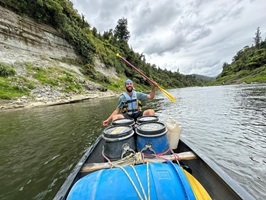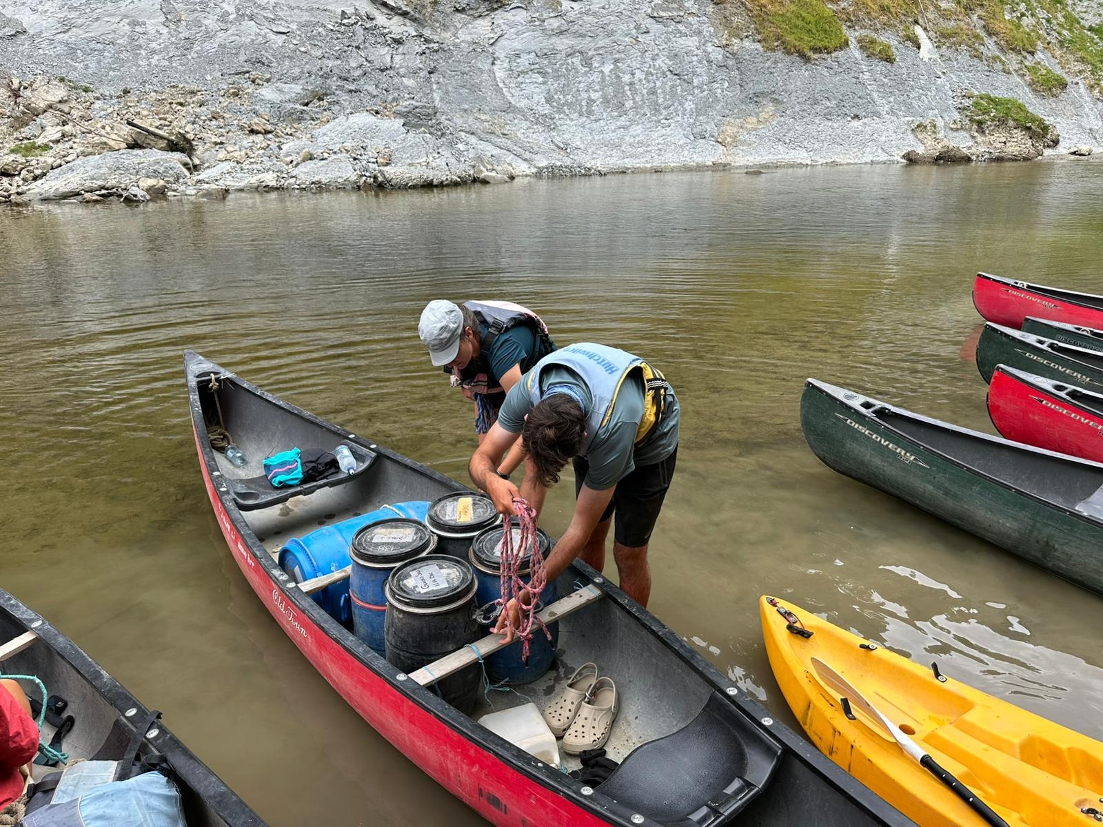 Der heutige Morgen begann glücklicherweise mit Sonnenschein, auch wenn der Gedanke an meine klatschnassen Shorts, in die ich für den Start schlüpfen musste, schon jetzt Überwindung kostete. Nach dem Frühstück schleppte ich meine beiden Fässer wieder hinunter zum Ufer, um sie im Boot zu verstauen. Wieder nahm sich Guido viel Zeit für die Sicherung der Fässer, bevor wir uns erneut in die Strömung begaben.