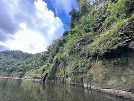 Die Wettervorhersage stimmte einen optimistisch und bis auf einen winzigen Schauer hielt sich die Vorhersage. Trotzdem blieb ich nicht trocken, da mich die Stromschnellen und die Strömung mehrfach erwischten. Dank des Sonnenscheins wurde mir jedoch nie lange kalt und meine Kleidung trocknete schnell am Körper. Die Landschaft wandelte sich im Laufe des Tages merklich. Während die Felswände anfangs noch an den Vortag erinnerten, wurden sie mit der Zeit flacher und weniger bewachsen. Dafür mischten sich immer häufiger Palmen und Farnbäume unter die Wälder und Wiesen.