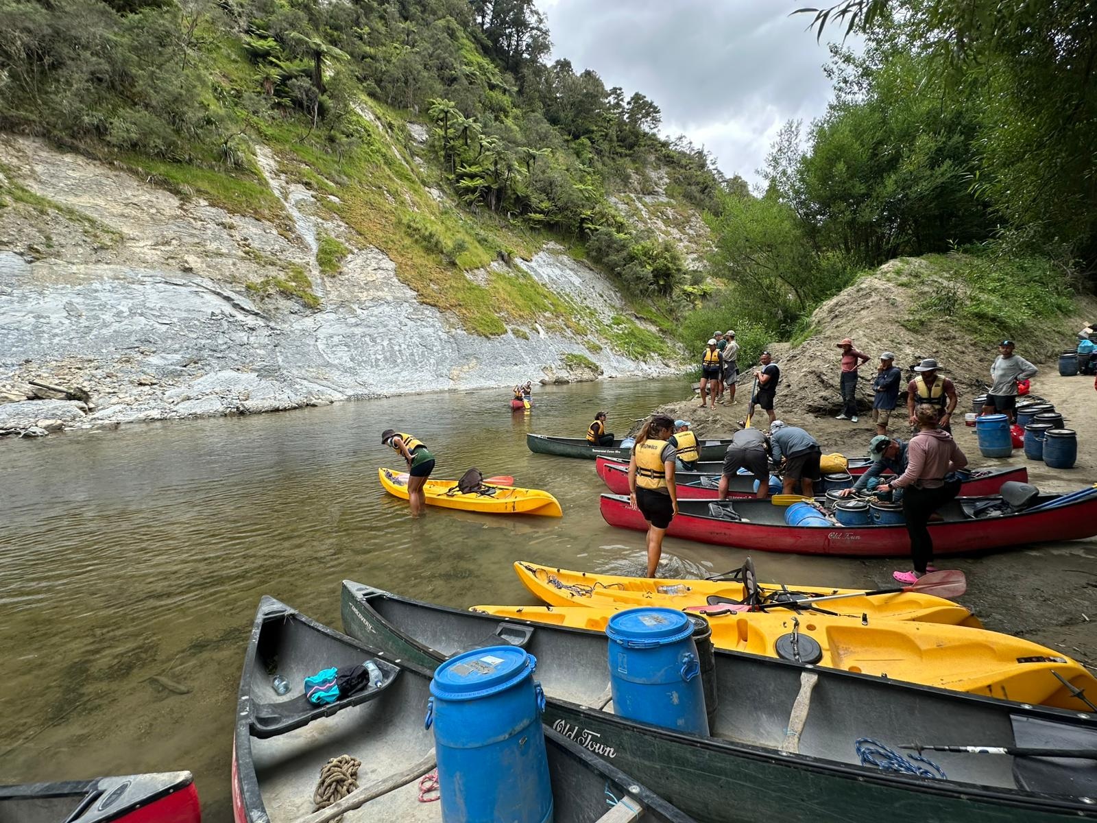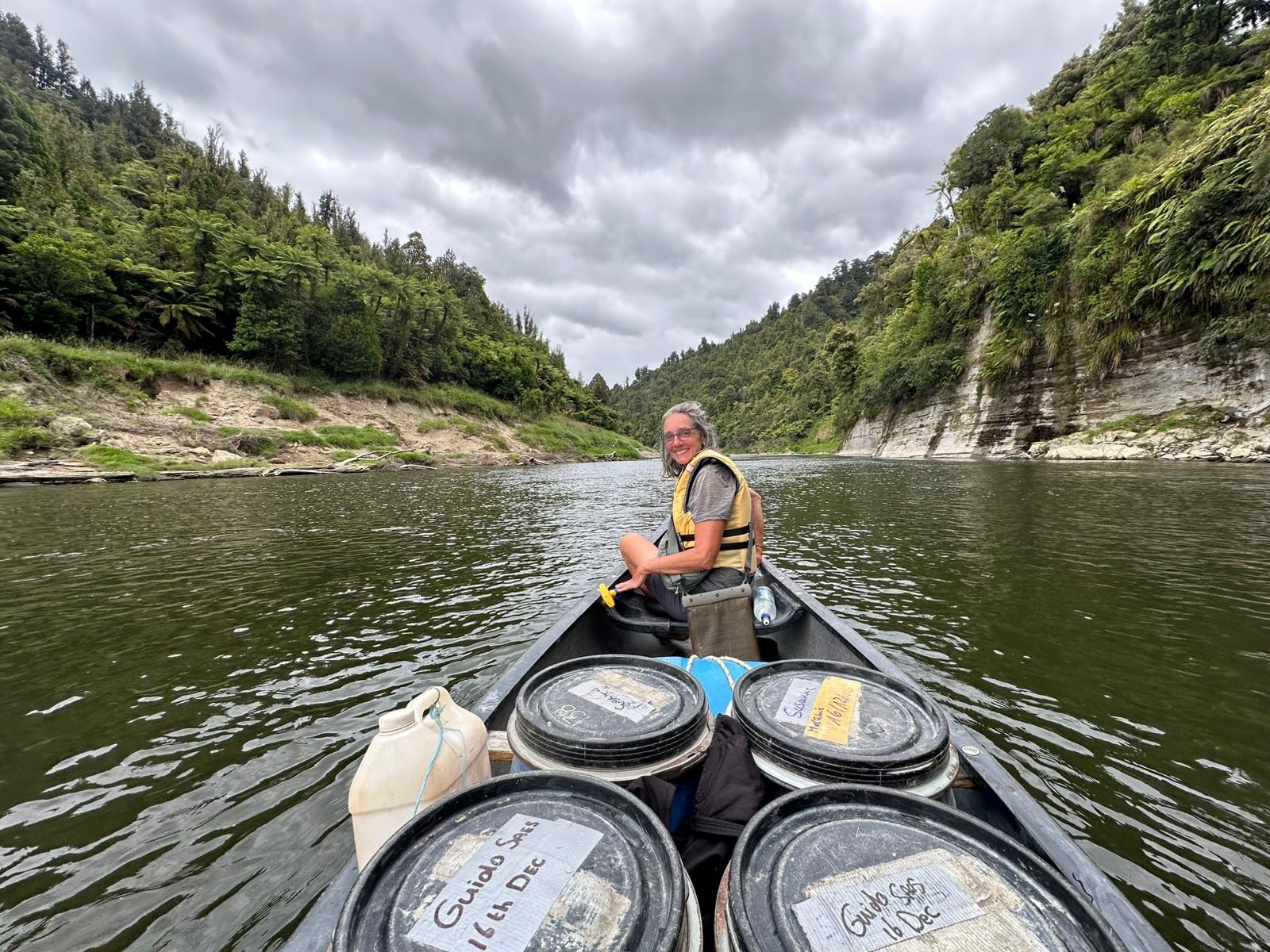 Für insgesamt fünf Tage tausche ich meine Wanderschuhe gegen ein Paddel ein, um die Whanganui River Journey zu bestreiten. Die Nacht vor dem Start war bereits unruhig, da der Blick in den wolkenverhangenen Sternenhimmel und die Vorhersage von schwerem Regen wenig Gutes verhießen. Die Kanus mussten abgeladen und mit den entsprechenden Seilen und Fässern bestückt werden. Jeder hatte zwei wasserdichte Fässer, 1 x Lebensmittel, 1 x für Alles, was trocken bleiben sollte. Für beide Personen im Kanu ein Fass, nicht wasserdicht für die Rucksäcke. Es hat gedauert, bis alles verschnürt war… Guido ist sehr sorgfältig und genau. Dann gab es noch die Rettungswesten um Paddel und sobald Platz war, ab in die Kanus.