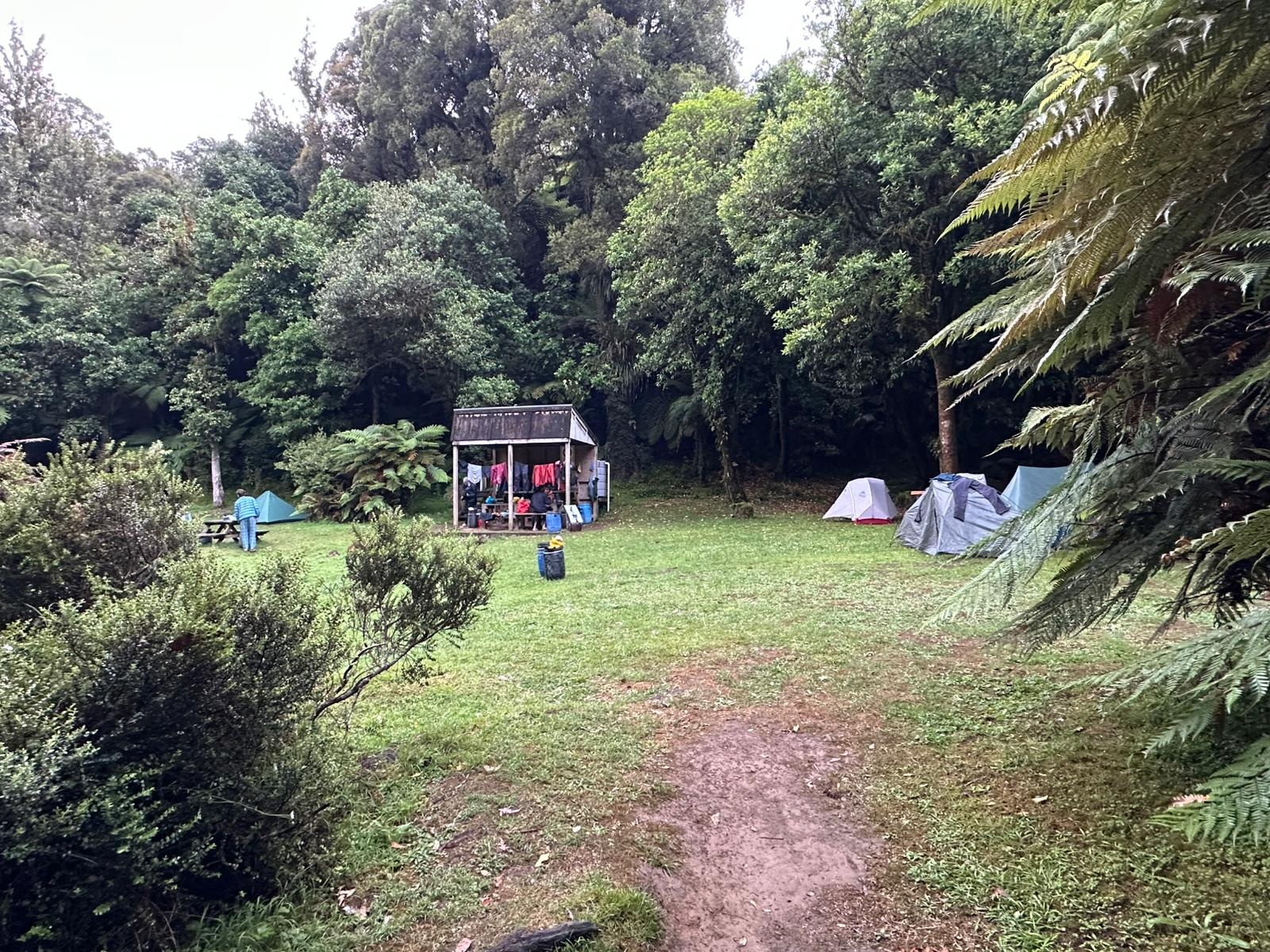 Nachdem wir am Hiponga Park angekommen waren, machten wir das Kanu fest und luden es aus. Die anschließende Schlepperei den Hang hinauf war zwar anstrengend, fiel mir aber deutlich leichter als am Vortag. Der Zeltplatz bot eine riesige Rasenfläche für bestimmt 50 Zelte mit Grillstellen, Picknicktischen und einer offenen Hütte. Zunächst nutzte ich die Sonne, um mein Zelt zu trocknen, doch kaum stand es, setzte der Regen ein, der den gesamten Nachmittag und Abend anhielt.
