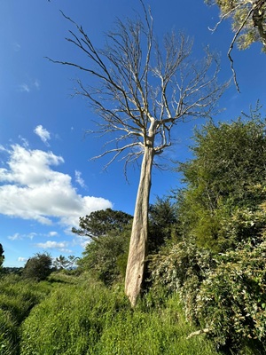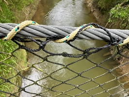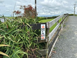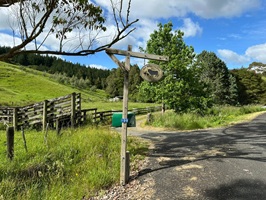 Der Khaniwhaniwa Fluss fließt nun neben mir, ich höre ihn, auch wenn ich ihn kaum durch Bäume und Büsche erkennen kann. Ein Schild informierte mich, dass die Brücke beschädigt ist. Jetzt konnte ich doch nicht einfach links rüber und durch den Fluss wollte ich auch nicht schwimmen, also musste ich noch mal ein bisschen weiterlaufen. Das allerletzte Stück ging dann über die Straße und ich war an der Farm angekommen. Ein entspannter, nicht allzu langer Wandertag war das.