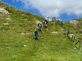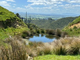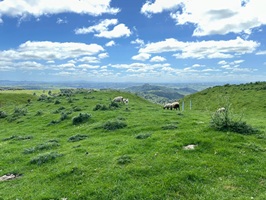 Stew brachte uns auch Wasser mit, da heute 27° vorhergesagt waren und es kaum Schatten geben sollte. Er meinte, wir bräuchten bestimmt 2 Liter pro Person. Ich hatte nur anderthalb, aber ich war optimistisch, dass es reichen würde. Nun ging es auf einer Schotterpiste schön bergauf, mit einem traumhaften Blick auf die Hügel.