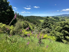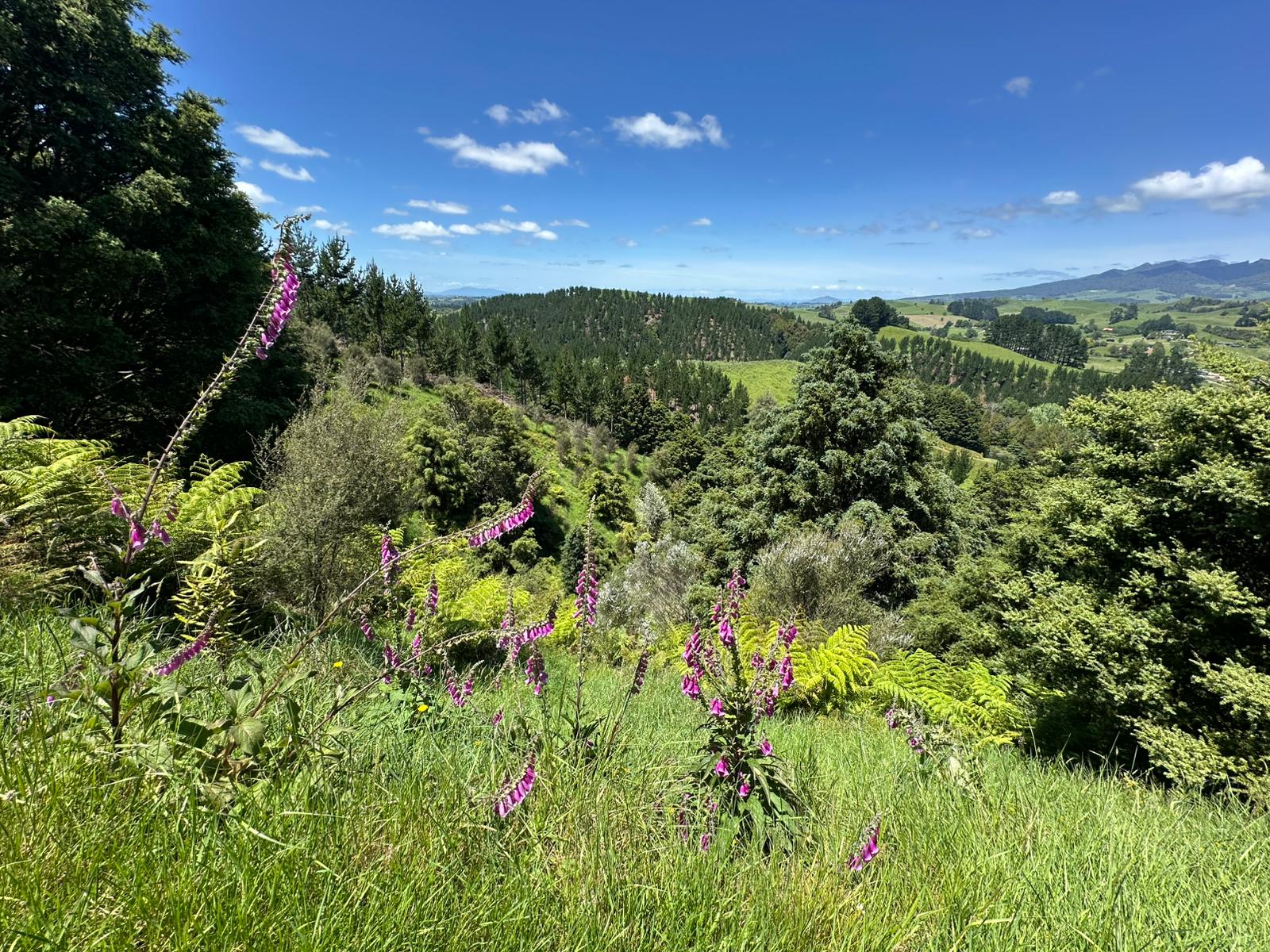 Am Abzweig bog ich mit dem Te Araroa ab und folgte einem grasbewachsenen Pfad. Die Sonne konnte sich am Morgen noch nicht richtig durchsetzen, aber es war feucht-warm. Überall am Weg wuchsen Fingerhüte. Heute entdeckte ich sogar einen weißen darunter.
