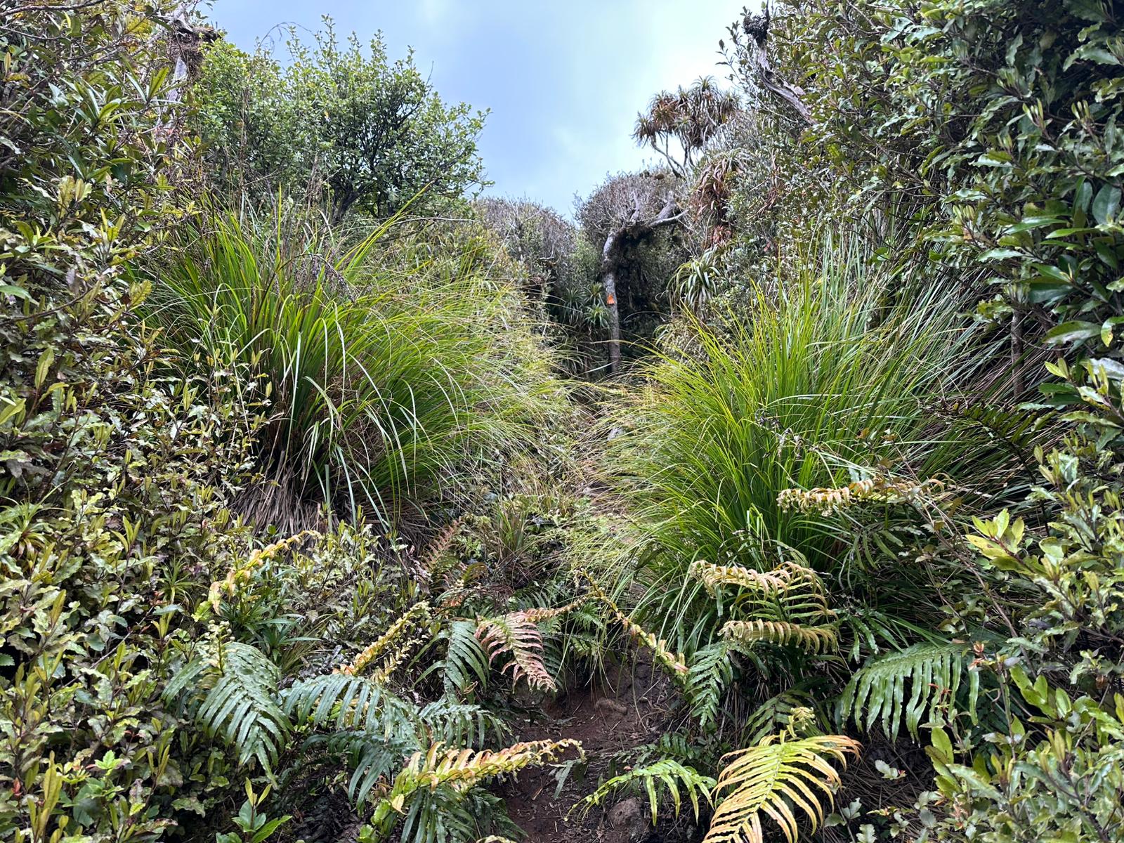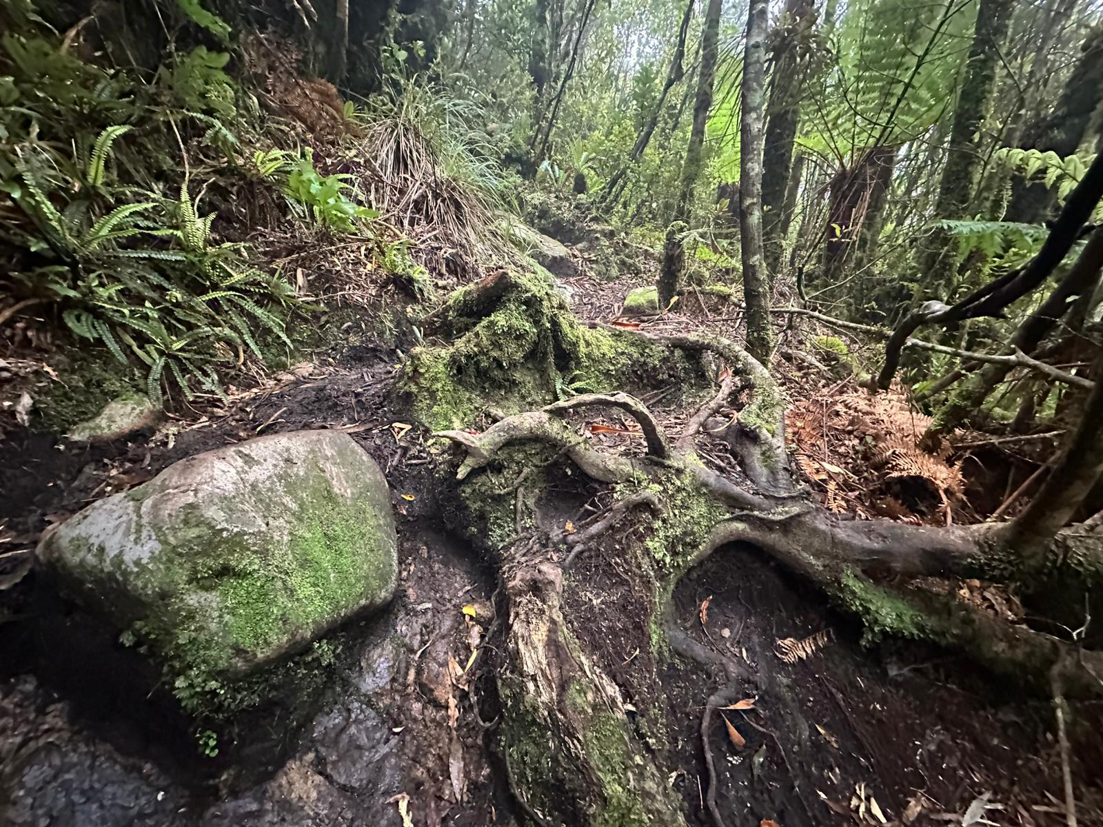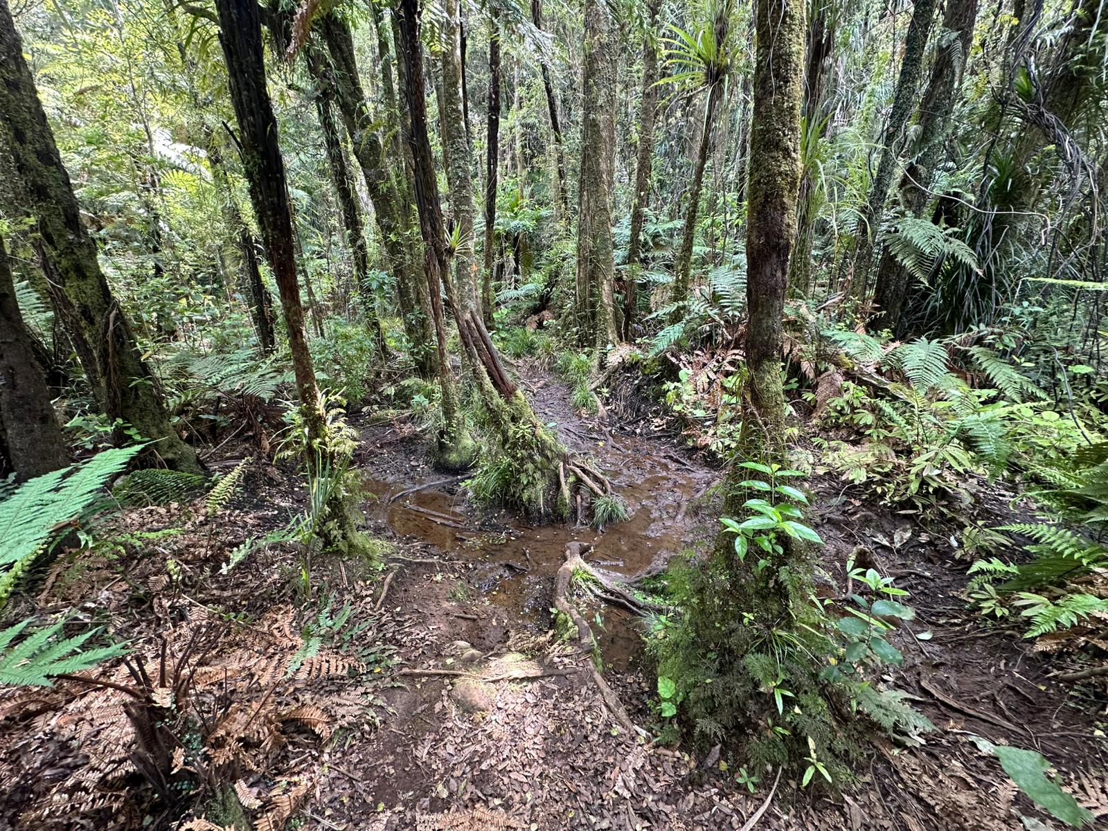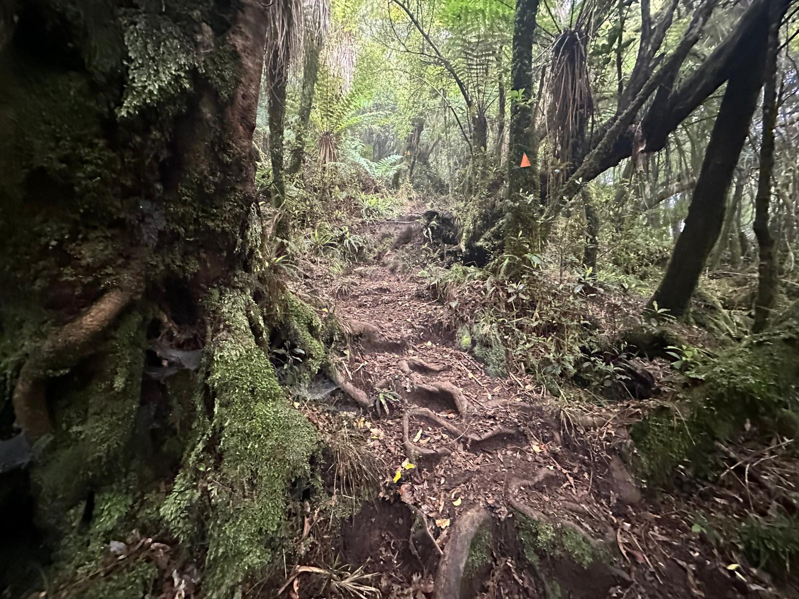 Nachdem man den dichten Gipfelwald verlassen hat, wird der Weg (Hihikiwi Track) allmählich breiter und ist gut markiert. Der Pfad folgt den Konturen des Berges, führt durch wechselnde Vegetation und beinhaltet weiterhin etliche schlammige und rutschige Abschnitte, besonders nach Regen. Kleinere kleine Bäche oder nasse Passagen überquert man gelegentlich über Holzstege.