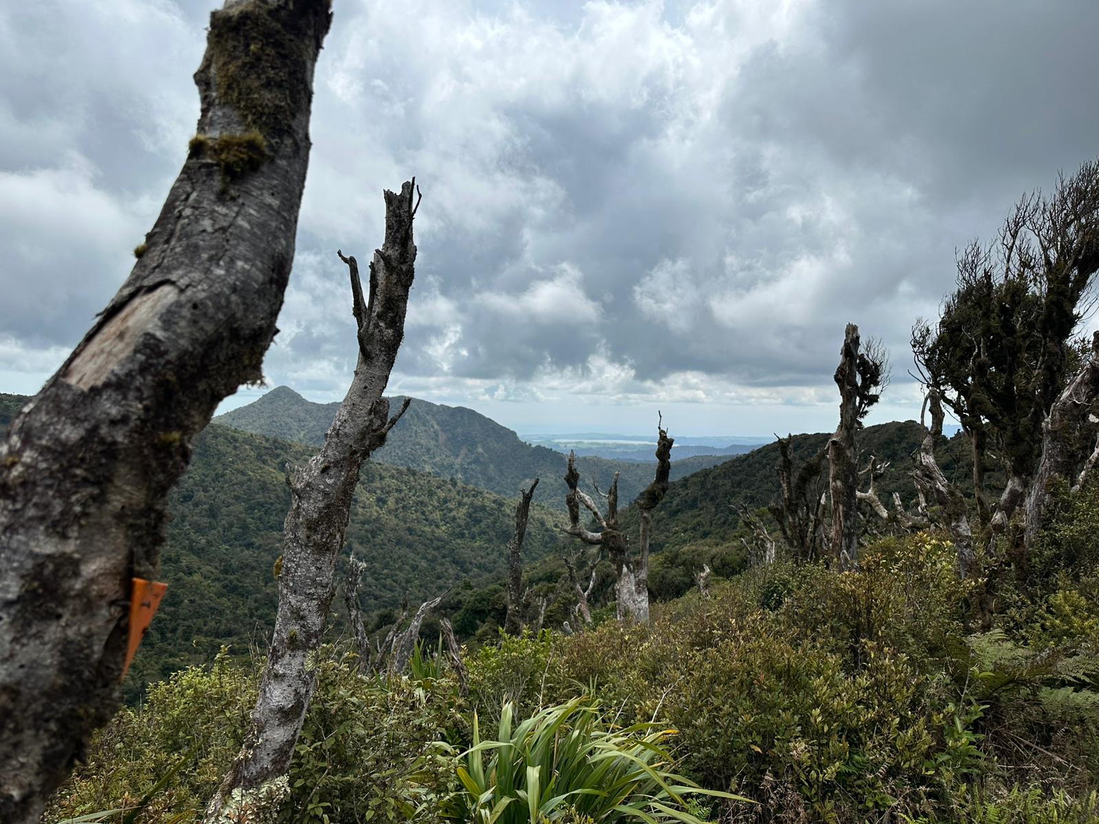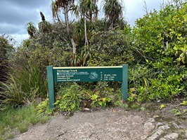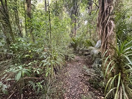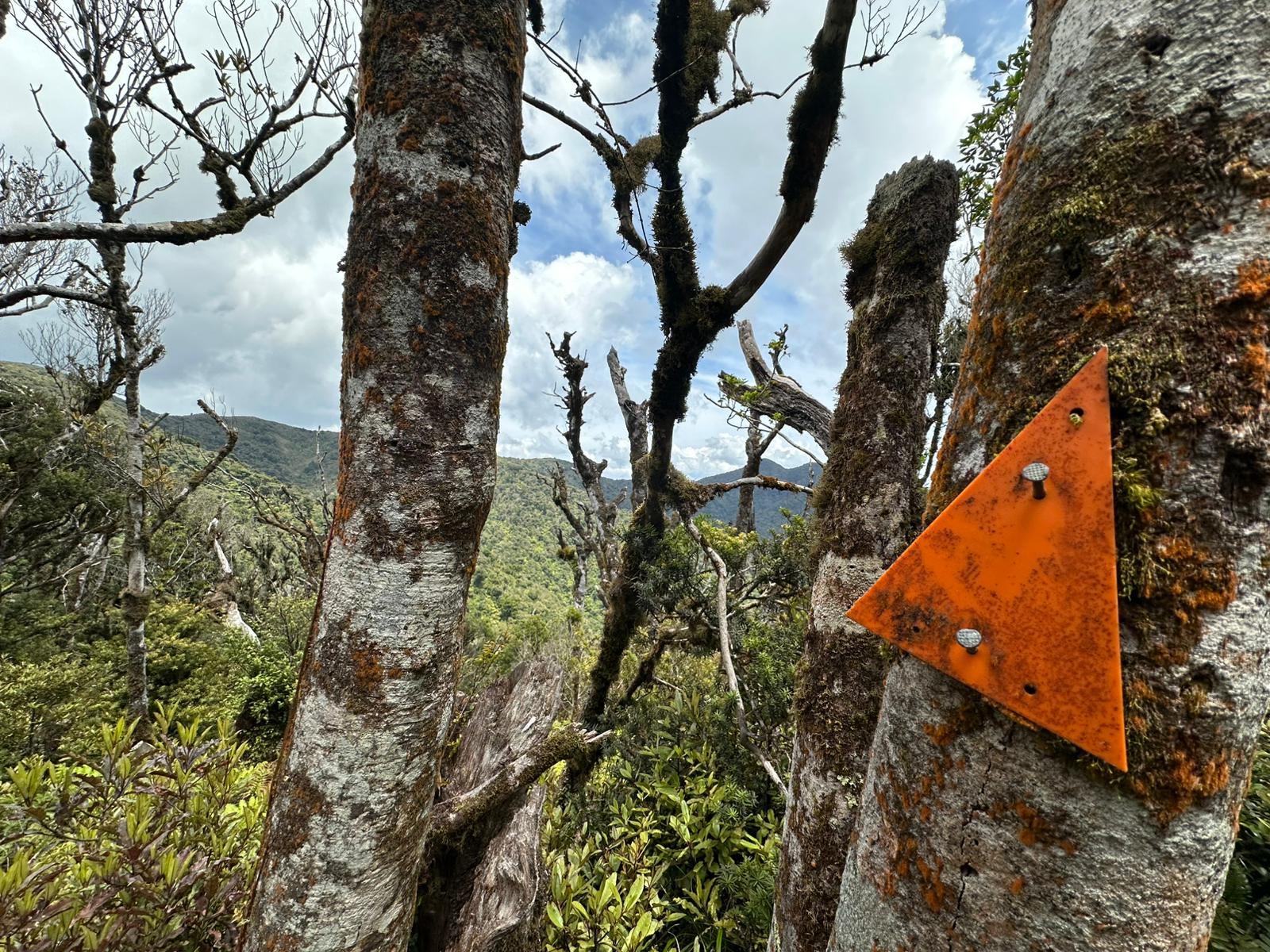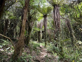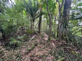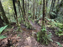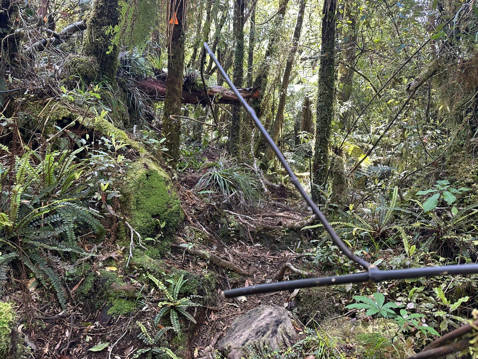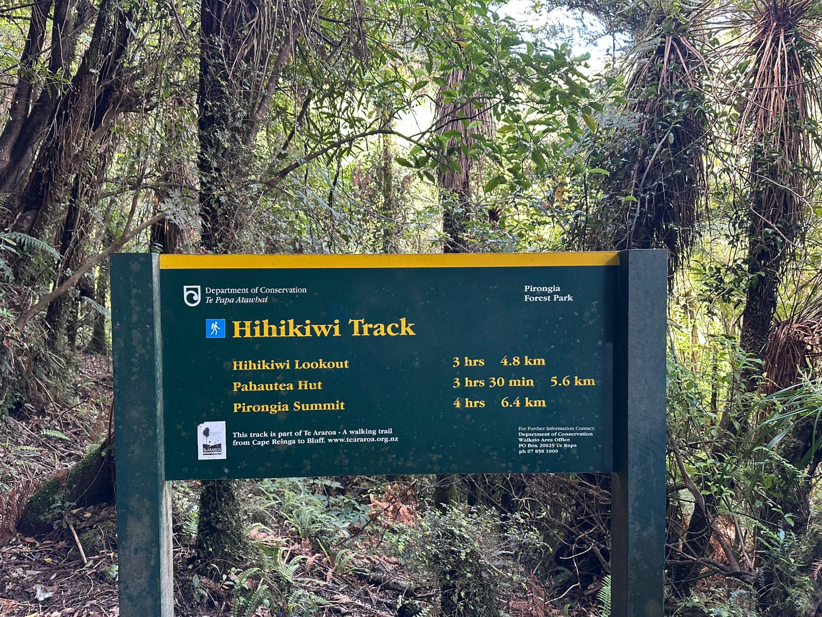 Nachdem man den dichten Gipfelwald verlassen hat, wird der Weg (Hihikiwi Track) allmählich breiter und ist gut markiert. Der Pfad folgt den Konturen des Berges, führt durch wechselnde Vegetation und beinhaltet weiterhin etliche schlammige und rutschige Abschnitte, besonders nach Regen. Kleinere kleine Bäche oder nasse Passagen überquert man gelegentlich über Holzstege.