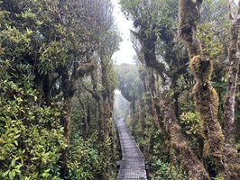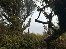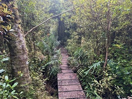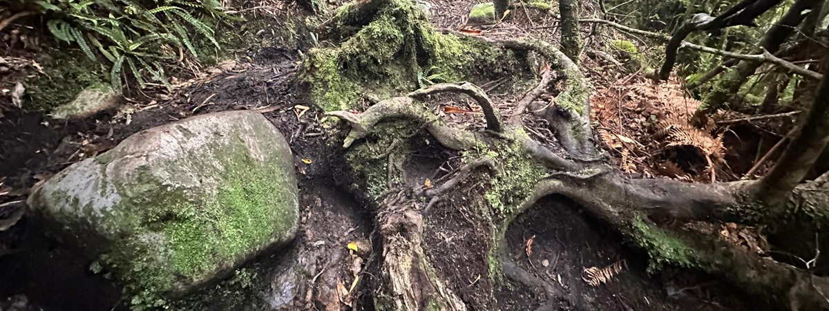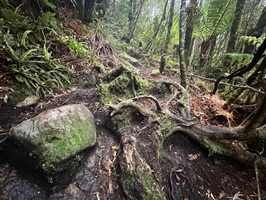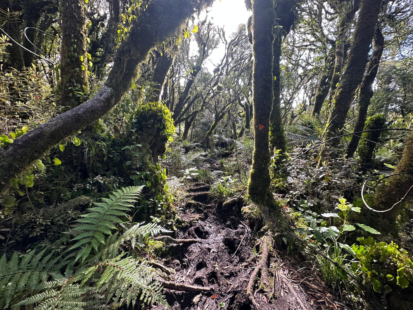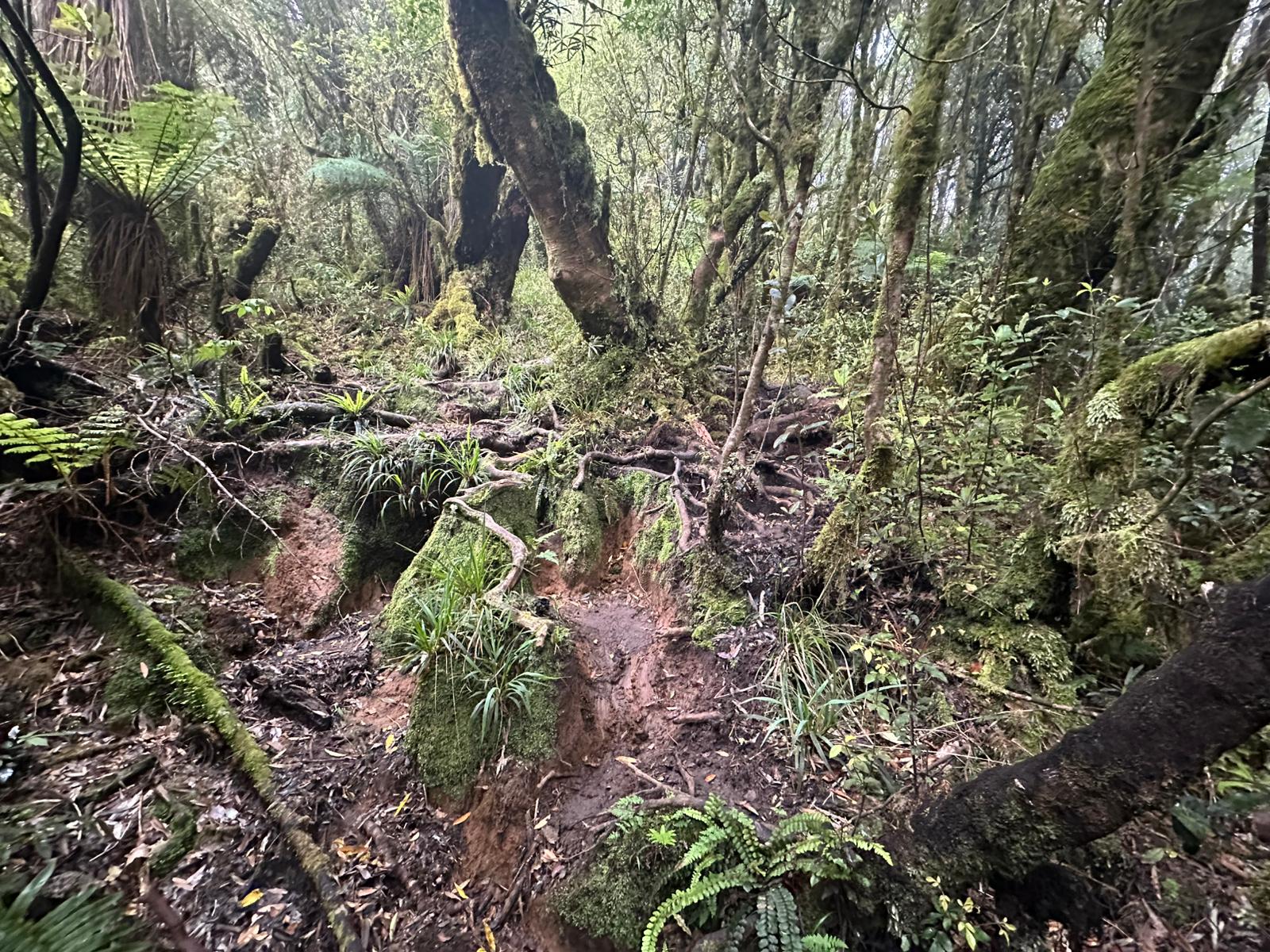 Der Abstieg vom Gipfel des Mount Pirongia beginnt in der Regel mit dem Pirongia Summit Track, der durch den nebelhaften, fast immer feuchten Wald mit zahllosen Baumbärten und Moosen führt, wobei es anfangs oft steil bergab geht. Es sind immerhin insgesamt gut 900 Meter Abstieg zu bewältigen. Der Pfad ist schmal, rutschig und zugewuchert, so dass man ständig aufmerksam sein muß.