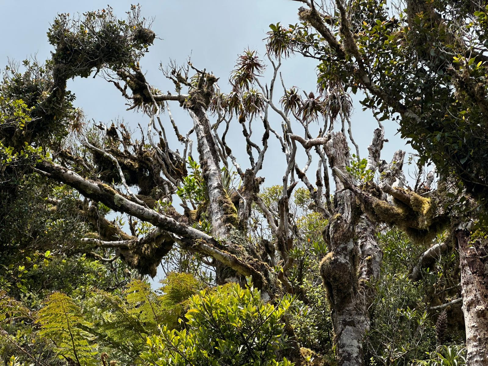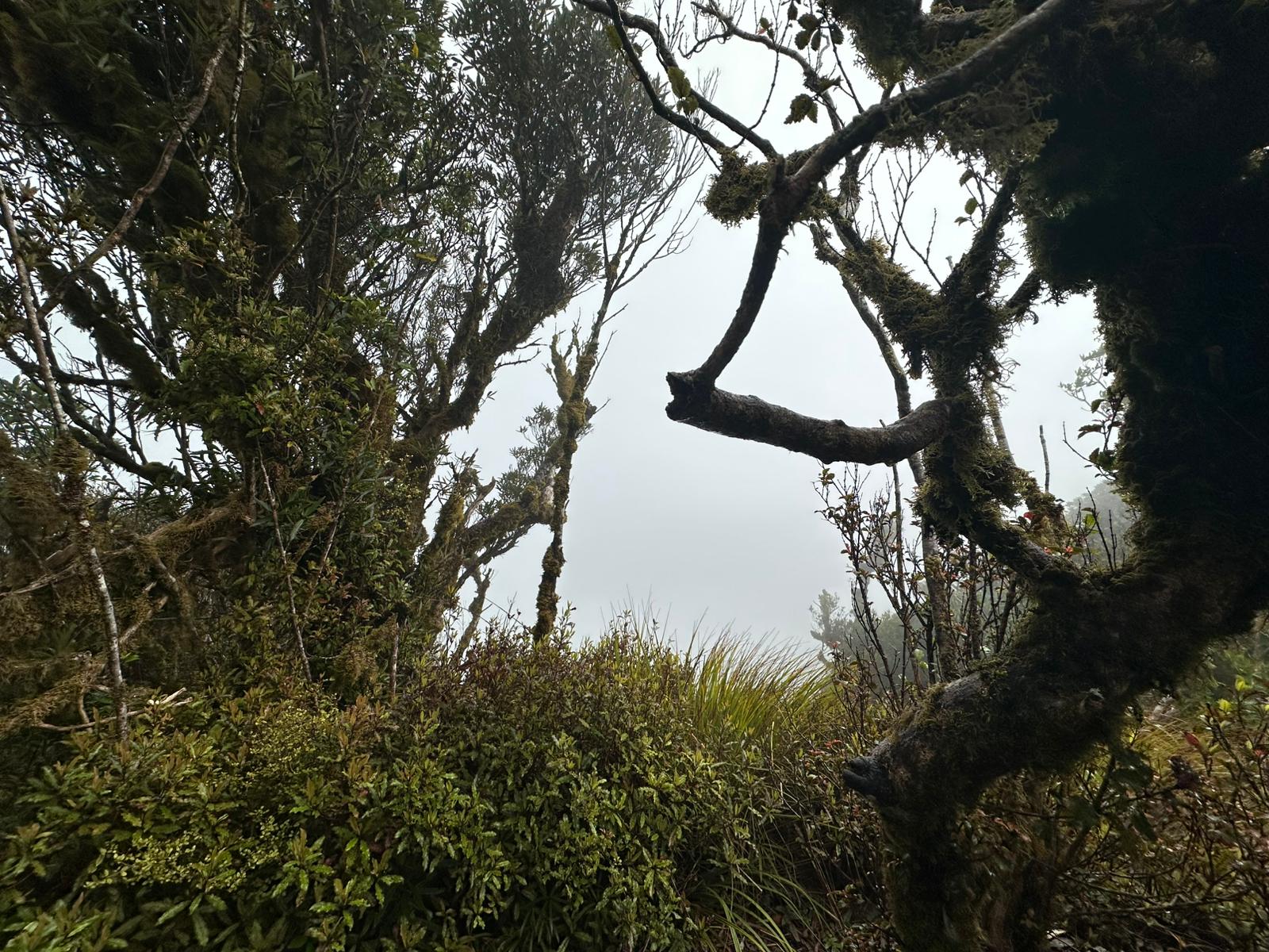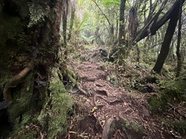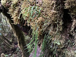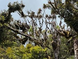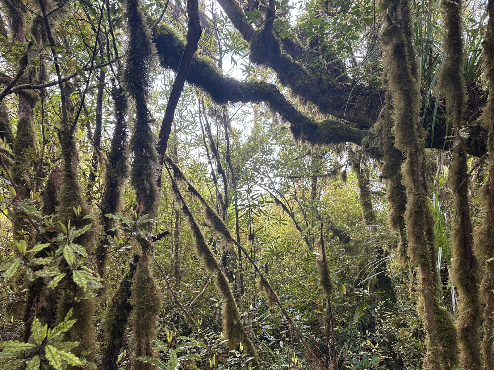 Der Abstieg vom Gipfel des Mount Pirongia beginnt in der Regel mit dem Pirongia Summit Track, der durch den nebelhaften, fast immer feuchten Wald mit zahllosen Baumbärten und Moosen führt, wobei es anfangs oft steil bergab geht. Es sind immerhin insgesamt gut 900 Meter Abstieg zu bewältigen. Der Pfad ist schmal, rutschig und zugewuchert, so dass man ständig aufmerksam sein muß.