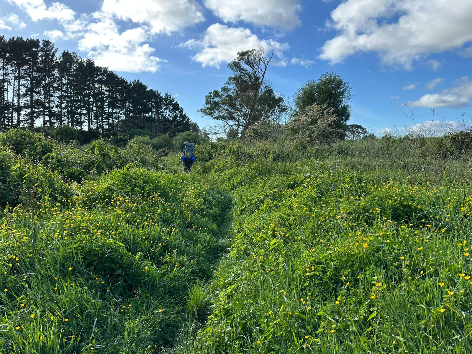 Aus dem angenehmen Wald kam ich schließlich heraus. Es war immer noch relativ diesig und fing langsam an zu tröpfeln. Die Wiesen dort blühten gelb, überall blühte der Hahnenfuß. Es war nicht mehr weit zum Shelter, wo ich eigentlich übernachten wollte und wo ich meine zweite Frühstückspause einlegte. Die anderen waren auch alle da, es wäre ein idealer Platz zum Übernachten gewesen.
