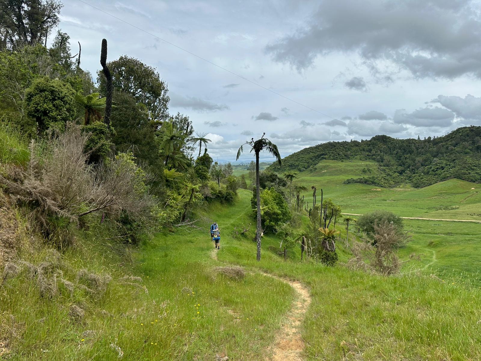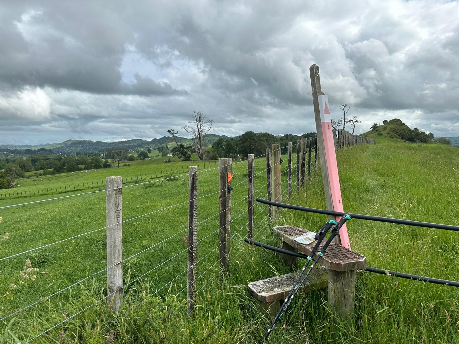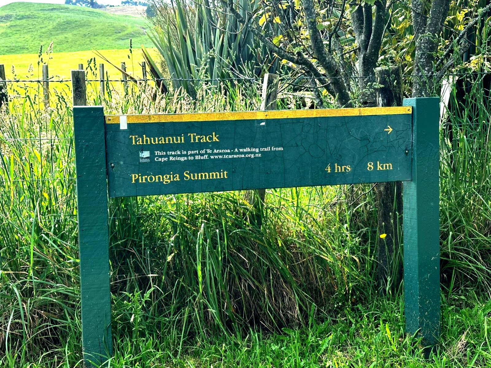 Ein wunderschöner Wiesenpfad zog sich vor mir hin. Als ich gerade das Schild sah: "17 km bis Waitomo in 5-6 Stunden", war ich erneut froh, dass wir die Glühwürmchenhöhle für heute storniert hatten. Ich wusste genau, wie gestresst ich mich gefühlt hätte, in viereinhalb Stunden hier durch sein zu müssen – also alles richtig gemacht gestern!