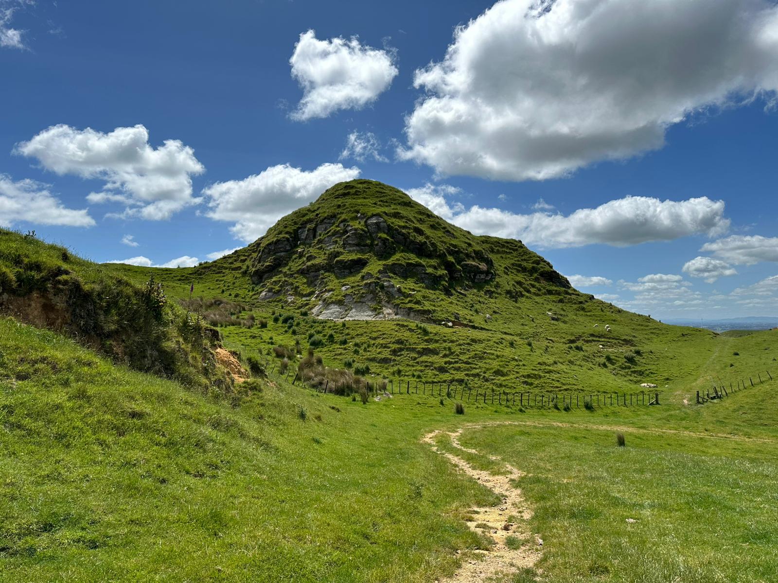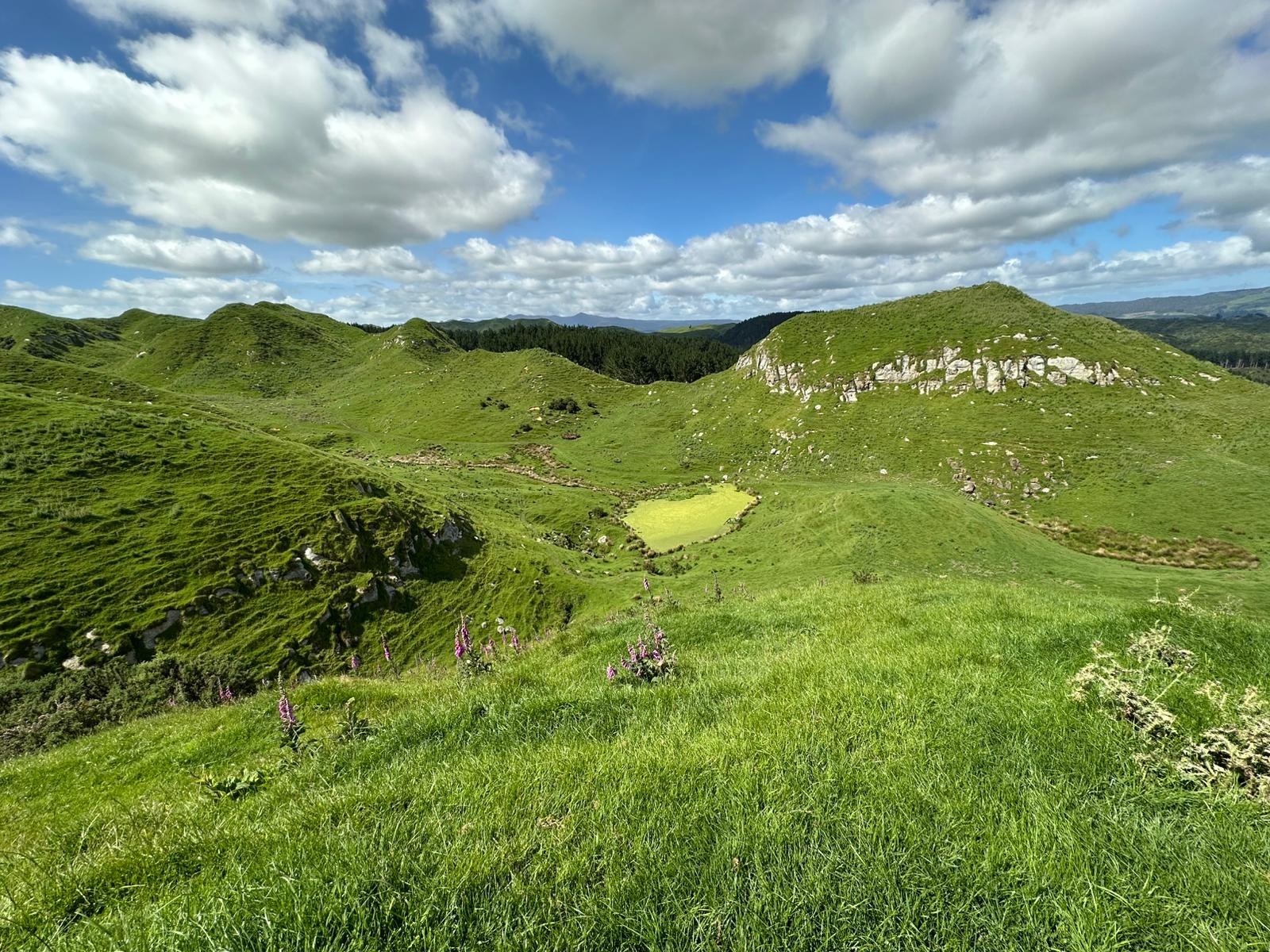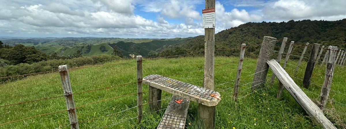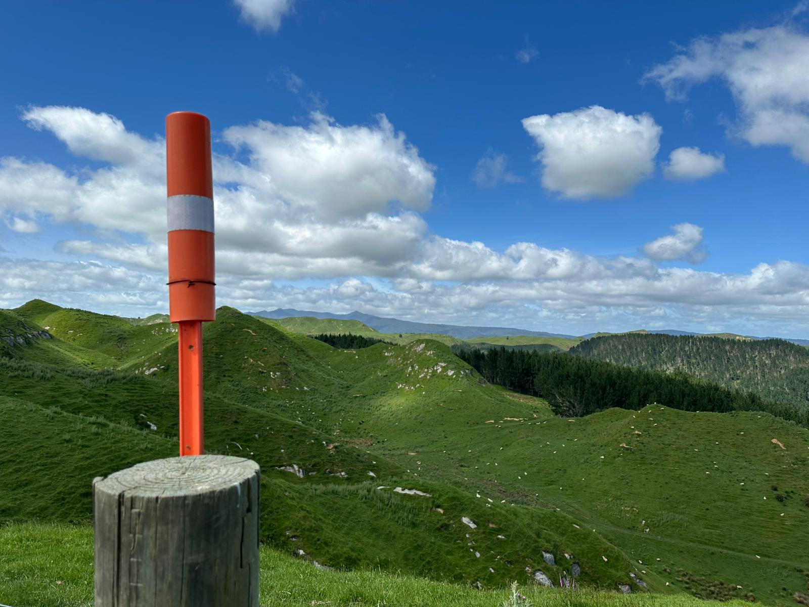 Ein wunderschöner Wiesenpfad zog sich vor mir hin. Als ich gerade das Schild sah: "17 km bis Waitomo in 5-6 Stunden", war ich erneut froh, dass wir die Glühwürmchenhöhle für heute storniert hatten. Ich wusste genau, wie gestresst ich mich gefühlt hätte, in viereinhalb Stunden hier durch sein zu müssen – also alles richtig gemacht gestern!