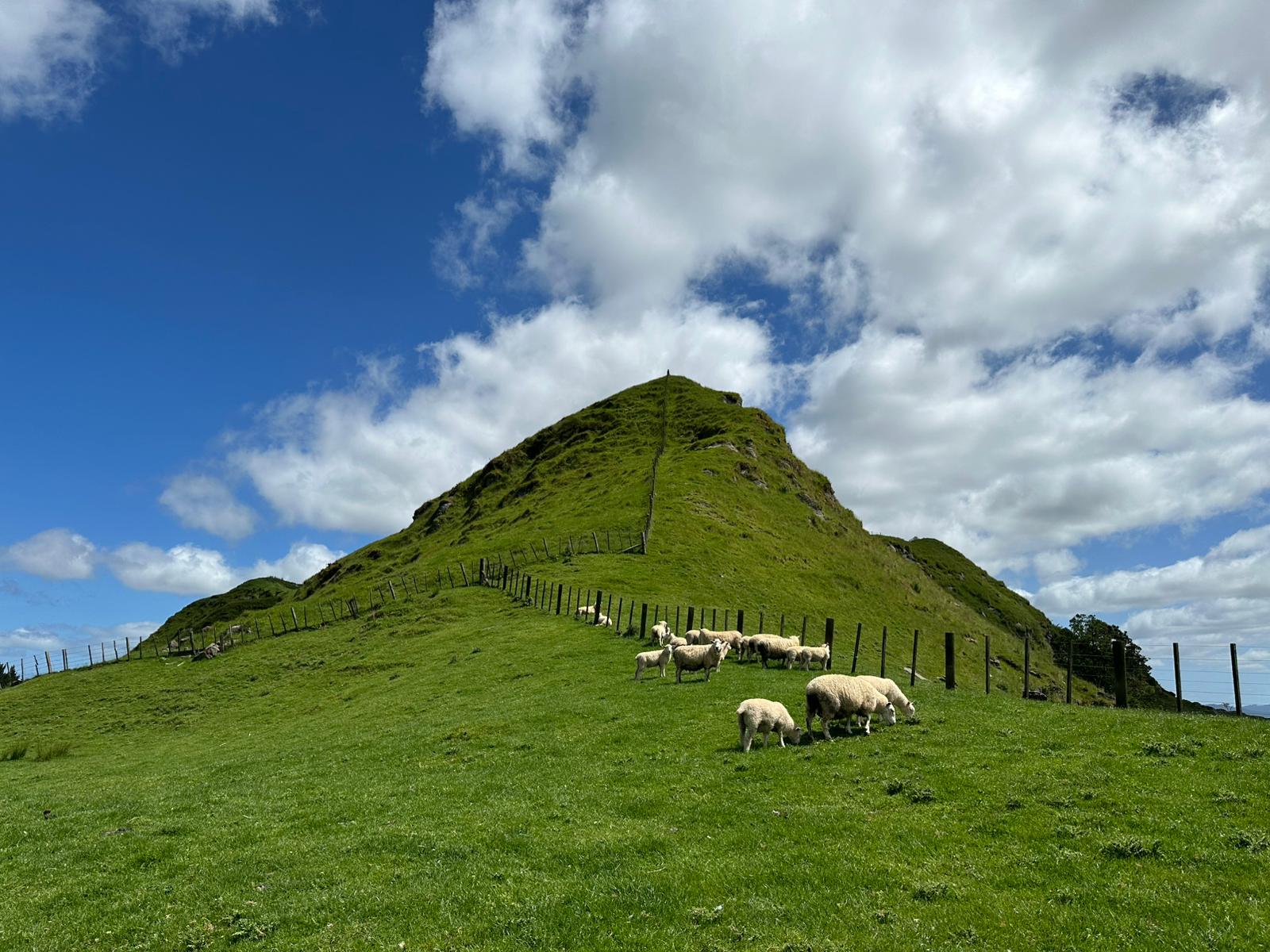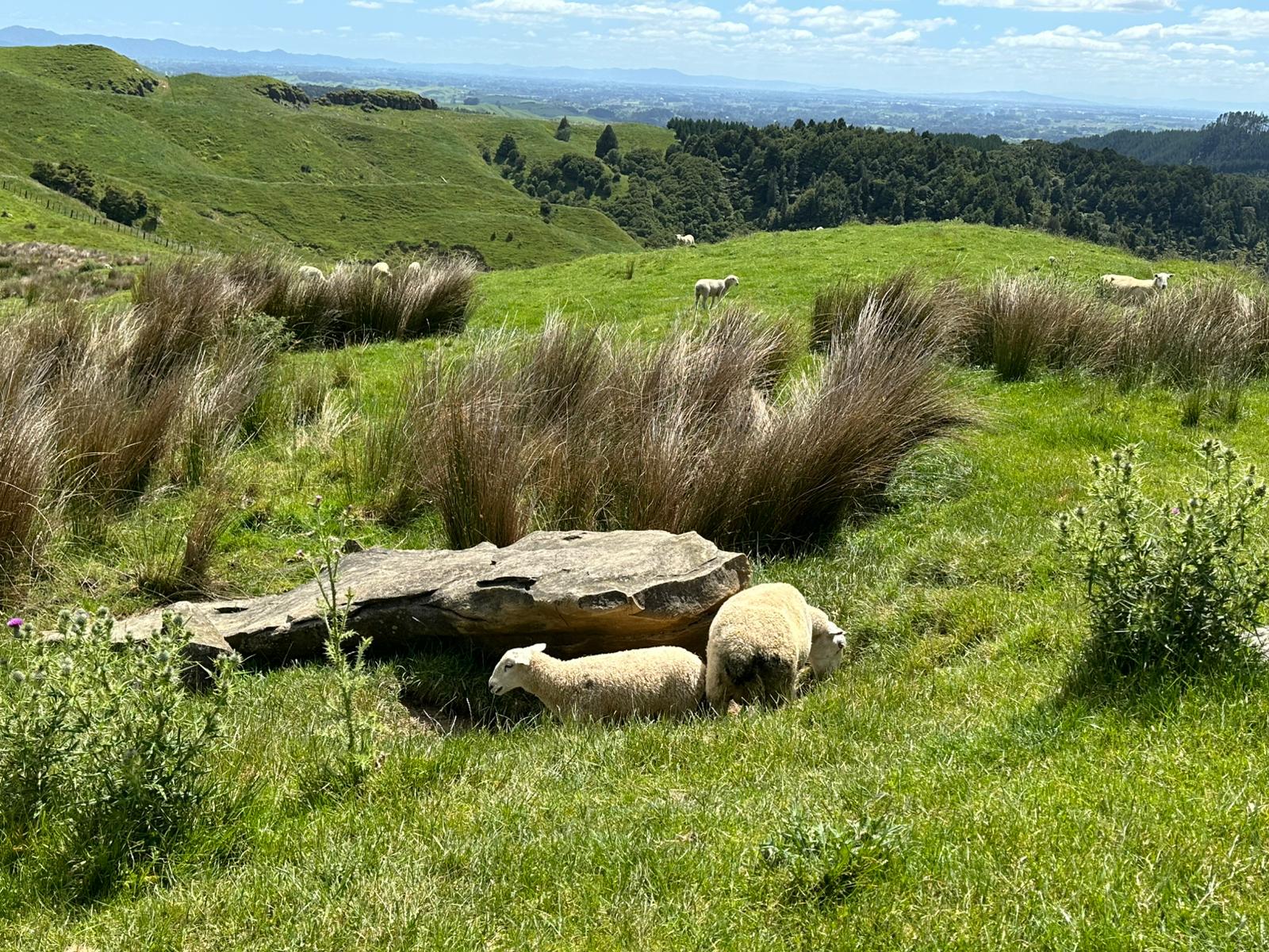 Dann begann der eigentliche Track: 8,5 km, veranschlagt für 3–4 Stunden, eine traumhafte Wanderung durch die hügelige Landschaft. Die Schafe guckten mir dabei zu. Mein Herz ging auf, so liebe ich es! Überall fraßen und glotzten Schafe in dieser weitläufigen Hügellandschaft. Immer wieder gab es vereinzelte Baumgruppen, in denen ich zur Überraschung Palmen entdeckte – ein ungewohnter Anblick in einer Weidelandschaft.