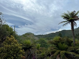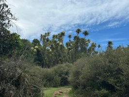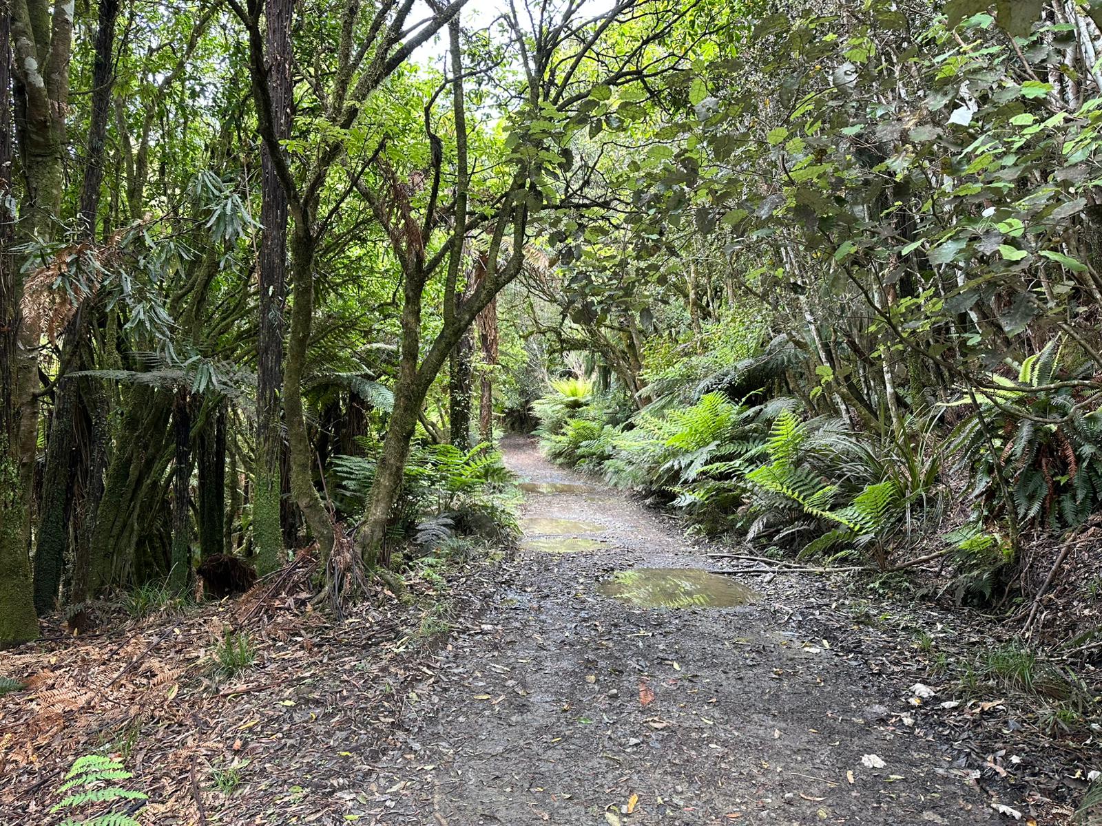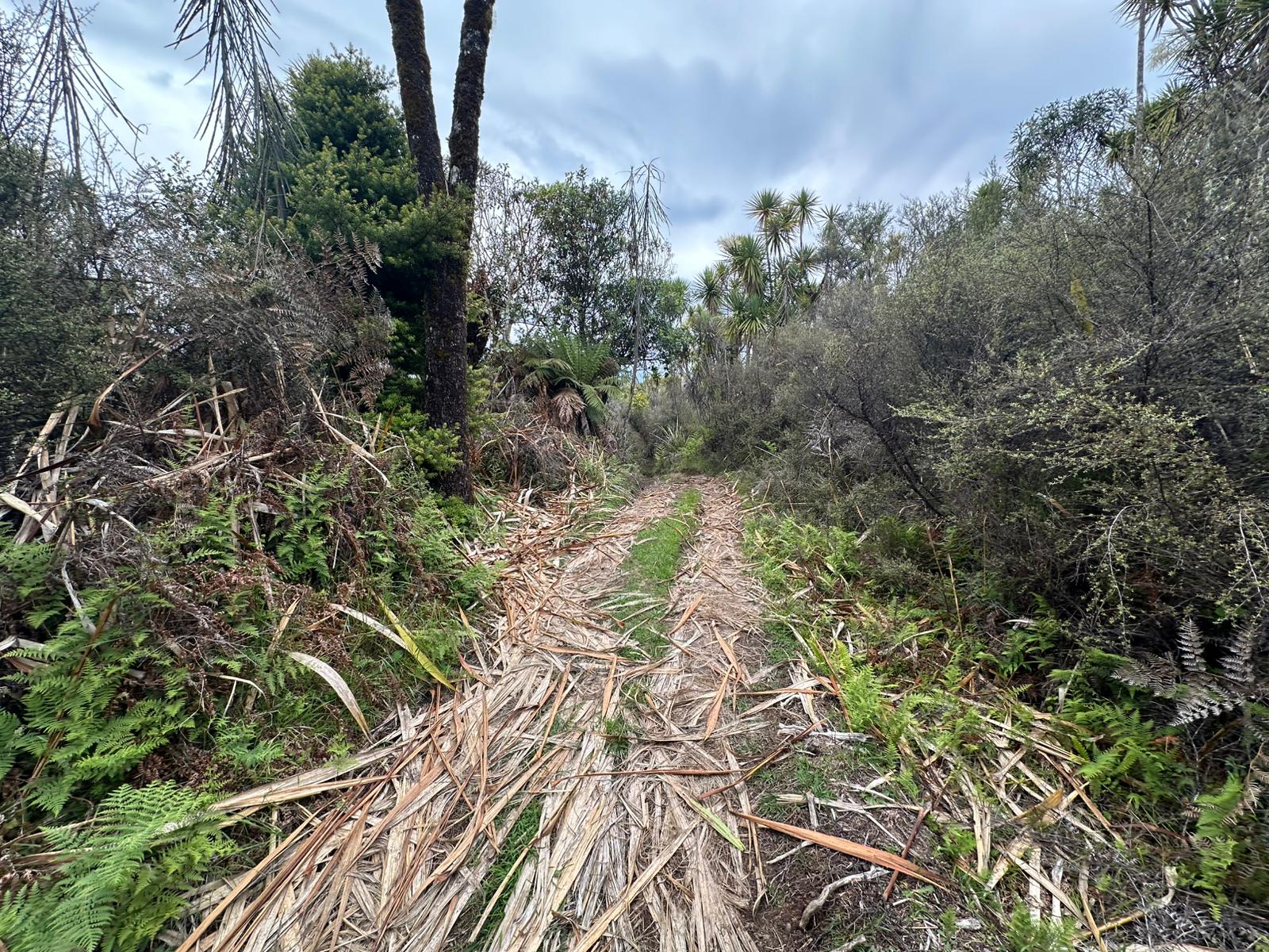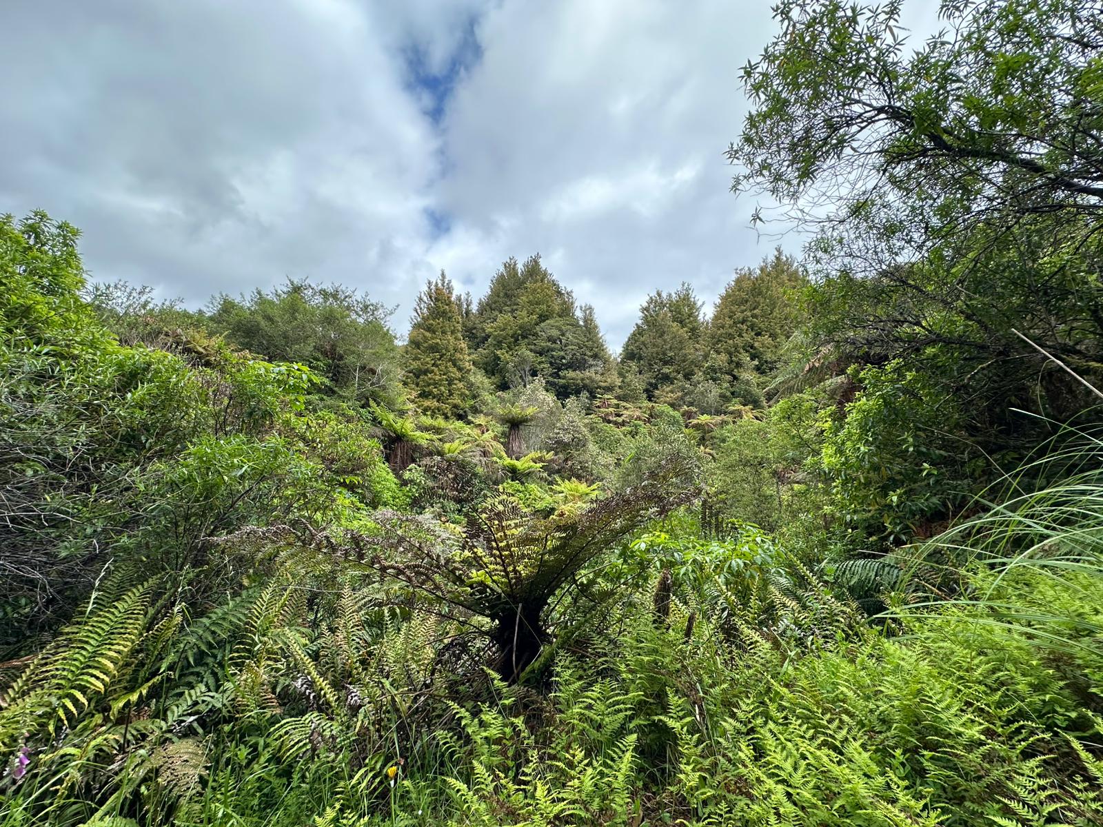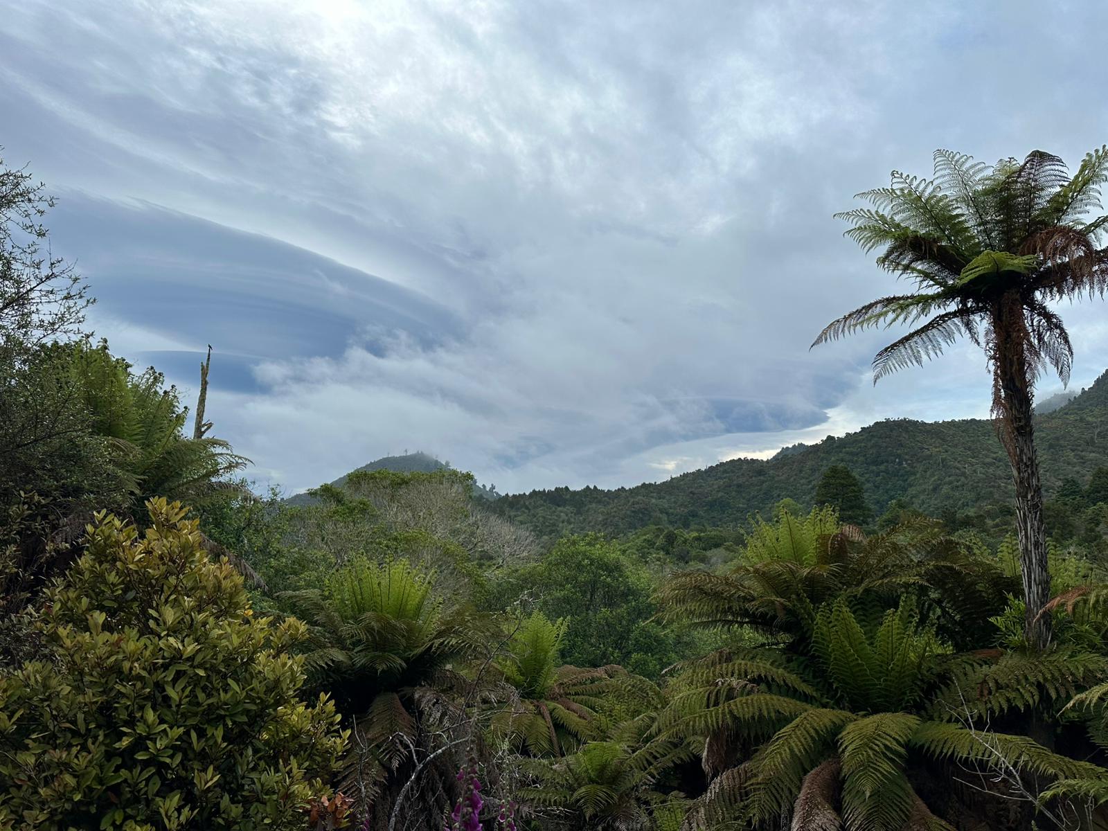 Die Farnbäume sahen stellenweise wirklich witzig aus; ihr verwelktes Laub hing herunter, als hätten sie einen Rock an. Kohlbäume (als "Kohlbaum" wird die Keulenlilie Cordyline australis, eine robuste, palmenähnliche Pflanze mit Blattschöpfen, bezeichnet. Sie kann bis 12 Meter hoch werden) säumten meinen Weg, ihre langen Blätter lagen vertrocknet auf dem Boden. Rechts von mir war der Himmel blau, während links eine Wolke hing, die aussah wie ein UFO. Es war ein richtig angenehmer Weg und ich genoss jeden Schritt.