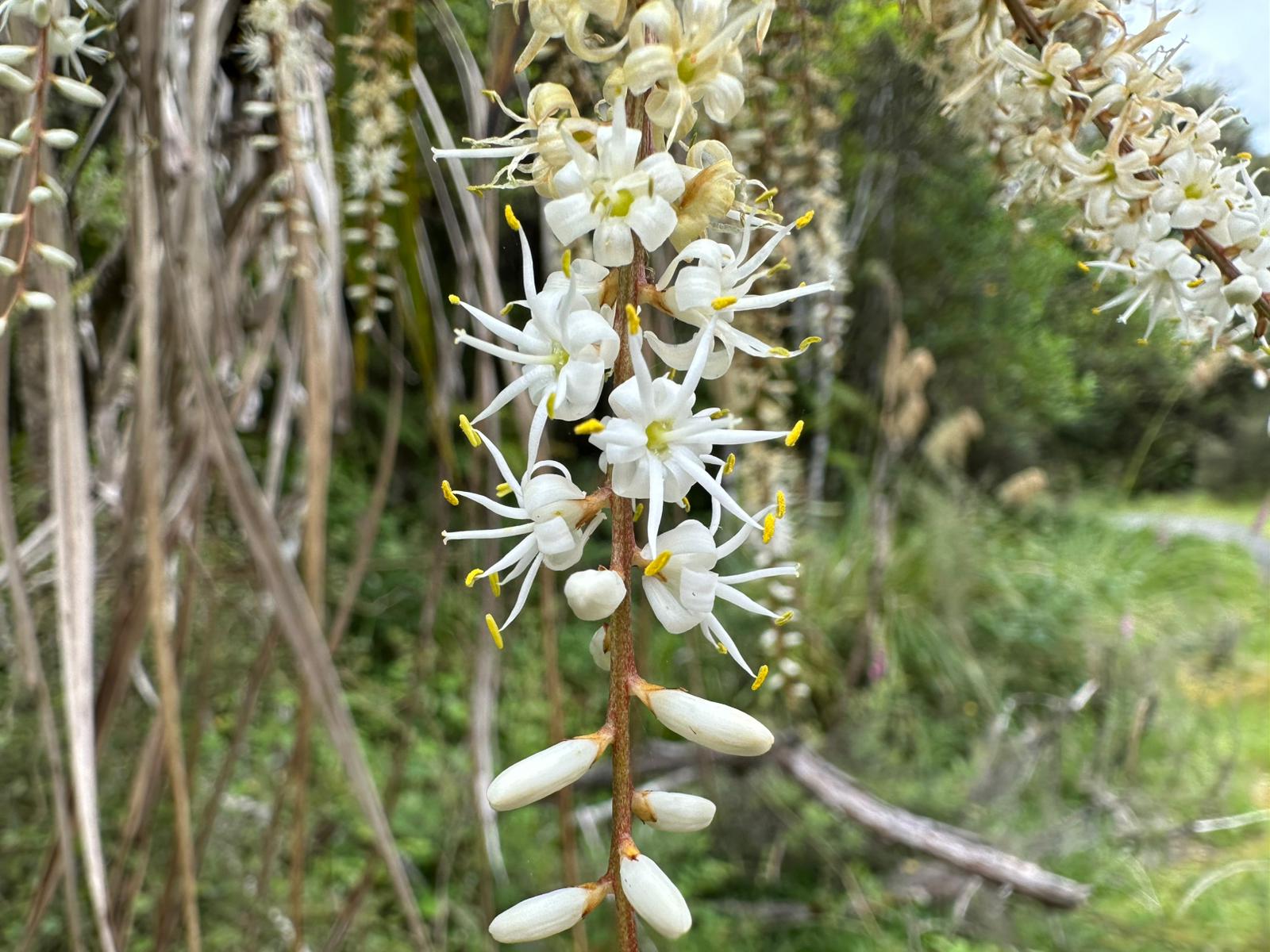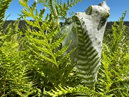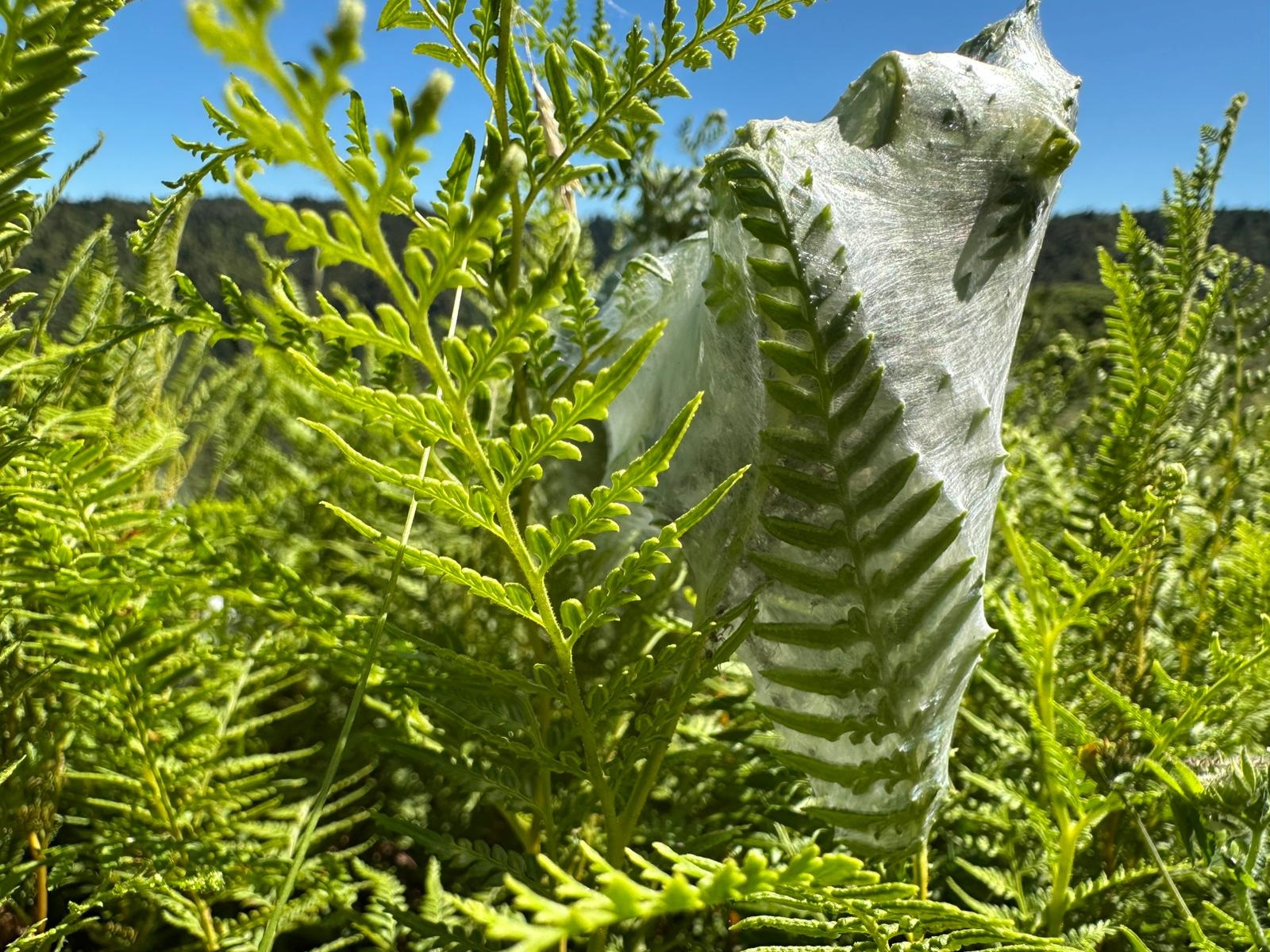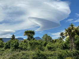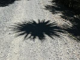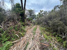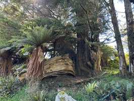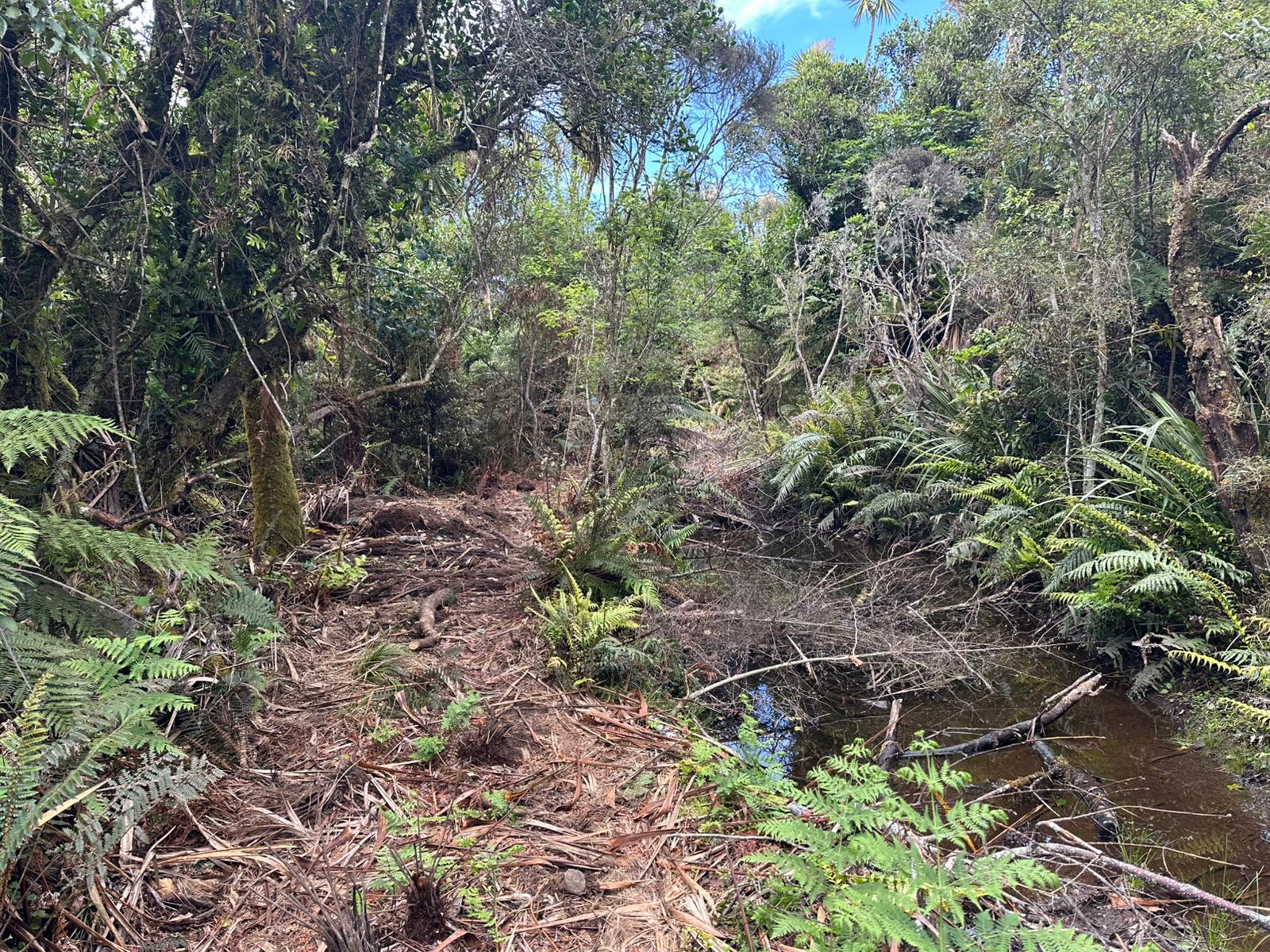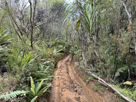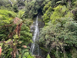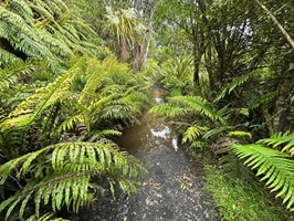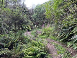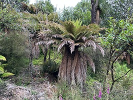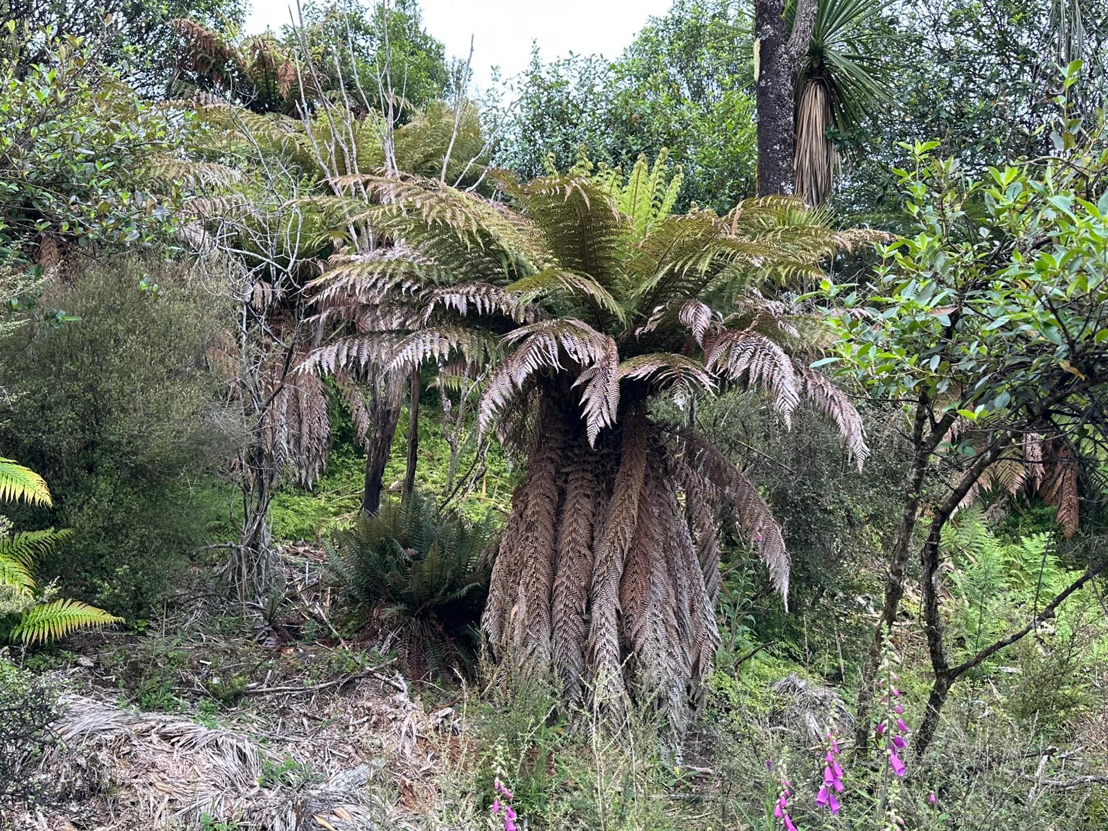 Die Farnbäume sahen stellenweise wirklich witzig aus; ihr verwelktes Laub hing herunter, als hätten sie einen Rock an. Kohlbäume (als "Kohlbaum" wird die Keulenlilie Cordyline australis, eine robuste, palmenähnliche Pflanze mit Blattschöpfen, bezeichnet. Sie kann bis 12 Meter hoch werden) säumten meinen Weg, ihre langen Blätter lagen vertrocknet auf dem Boden. Rechts von mir war der Himmel blau, während links eine Wolke hing, die aussah wie ein UFO. Es war ein richtig angenehmer Weg und ich genoss jeden Schritt.