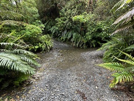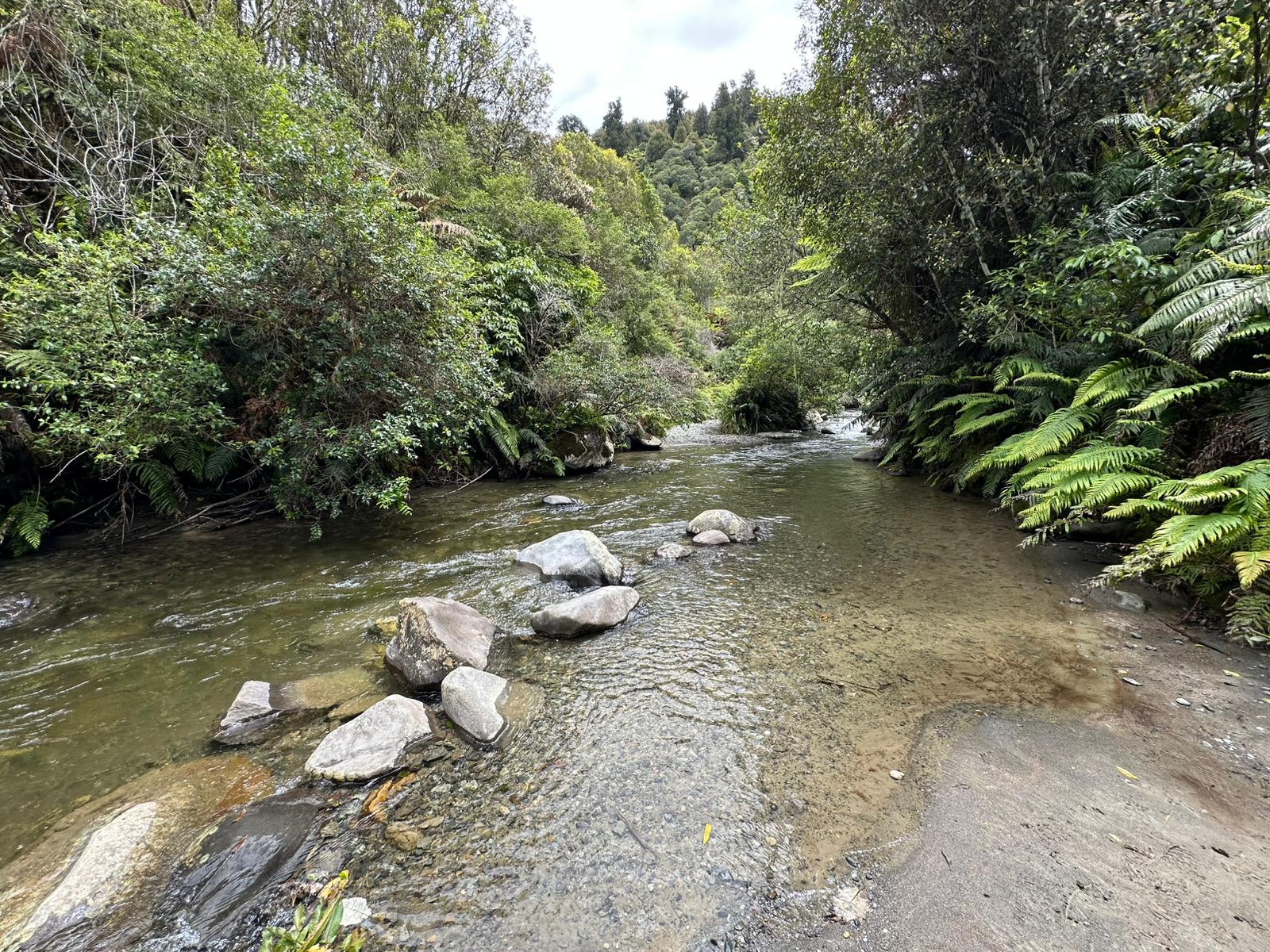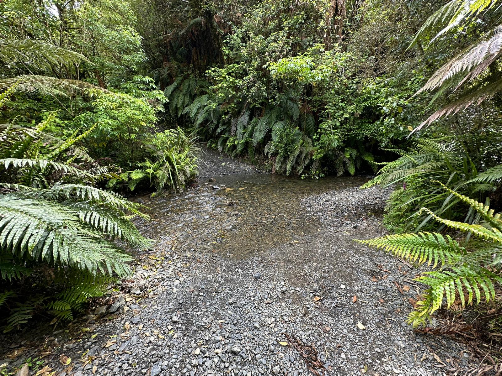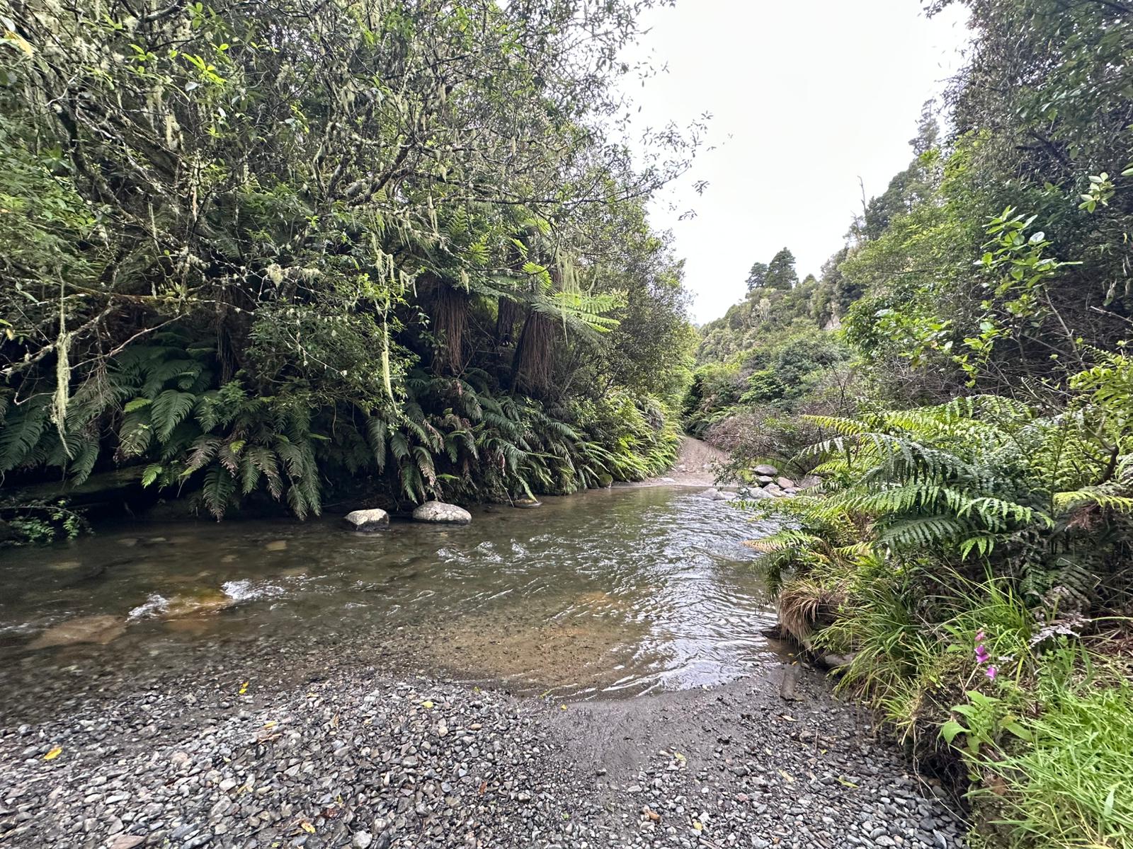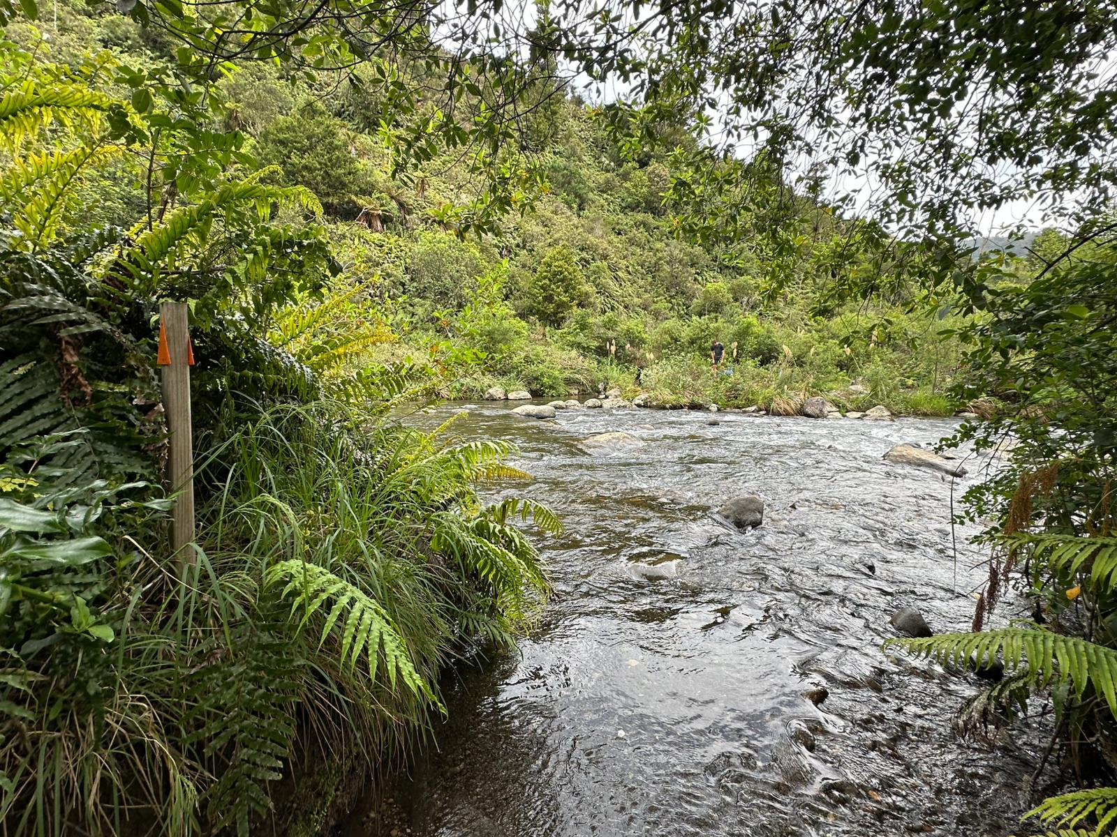 Nun ging es steil bergab auf einem schmalen Pfad und ich hörte das Rauschen des Mangatepopo River. Er kam bald in Sicht, doch ich hatte ihn breiter erwartet. Problemlos konnte ich ihn queren. Dann hörte ich von vorne ein noch stärkeres Rauschen, und da kam er: ein zweiter Fluss, etwas breiter, das Wasser reichte mir zehn Zentimeter über die Knie. Ich schaffte es gut hindurch, zog am Ufer meine Schuhe wieder an und ging weiter.