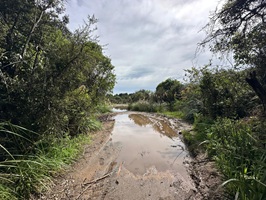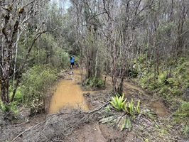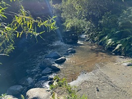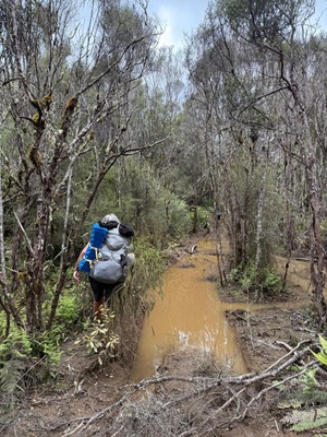 Dieser Abschnitt gilt als etwas schwieriger und nach Regenfällen kaum begehbar, weshalb wir uns entschlossen, den ausgewiesenen Bypass zu nehmen. Ich glaube, mir steckte der anstrengende Tag von vorgestern immer noch mental in den Knochen. Auf dem Weg mussten wir kleinere Bäche überqueren und versuchten sehr, trockene Füße zu behalten. An einem breiterer Bach wollte ich wieder geschickt über die Steine balancieren - hat leider nicht ganz funktioniert: Mein rechter Fuß landete im Wasser – Mist!