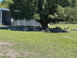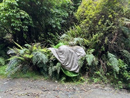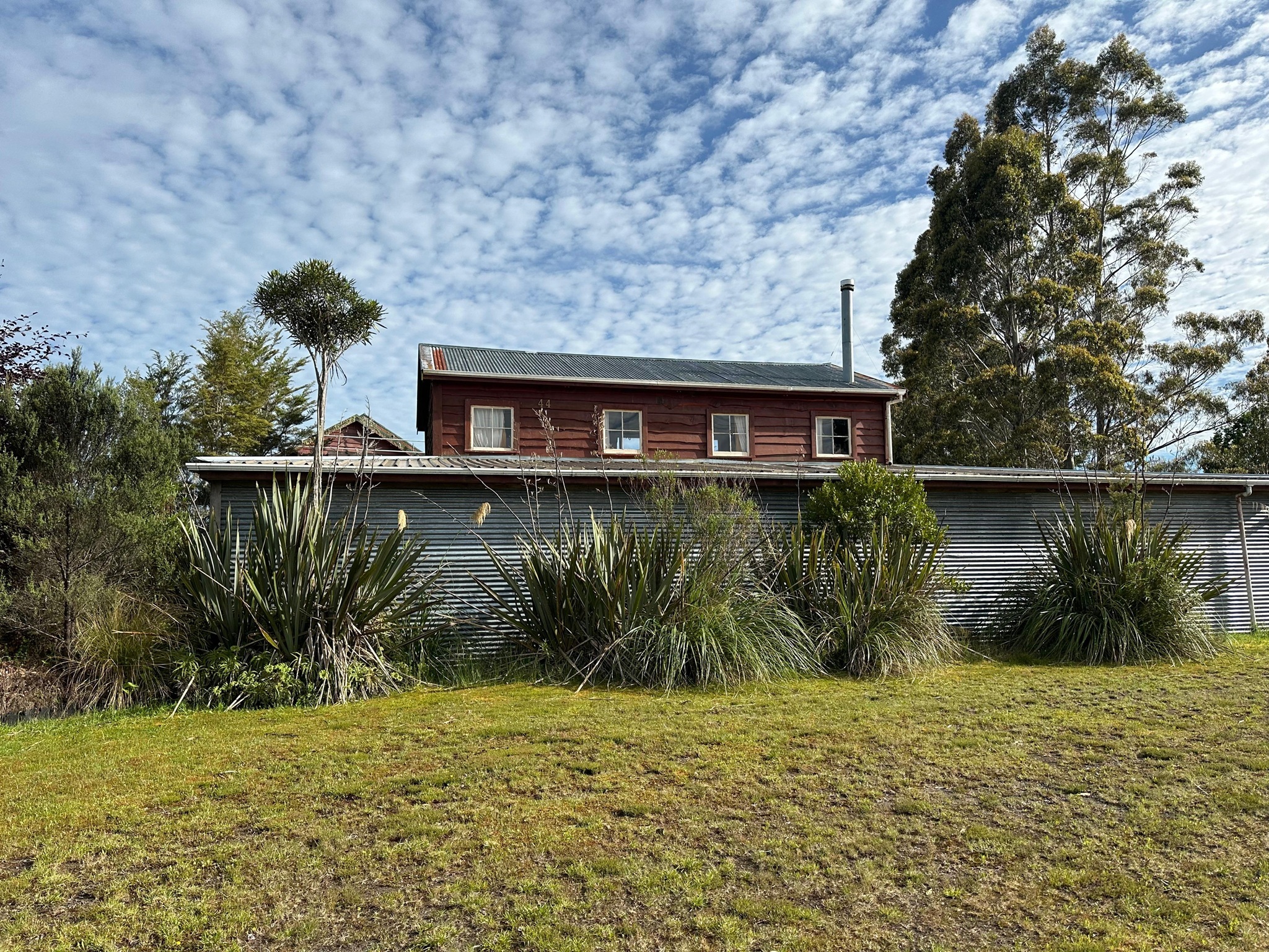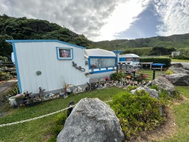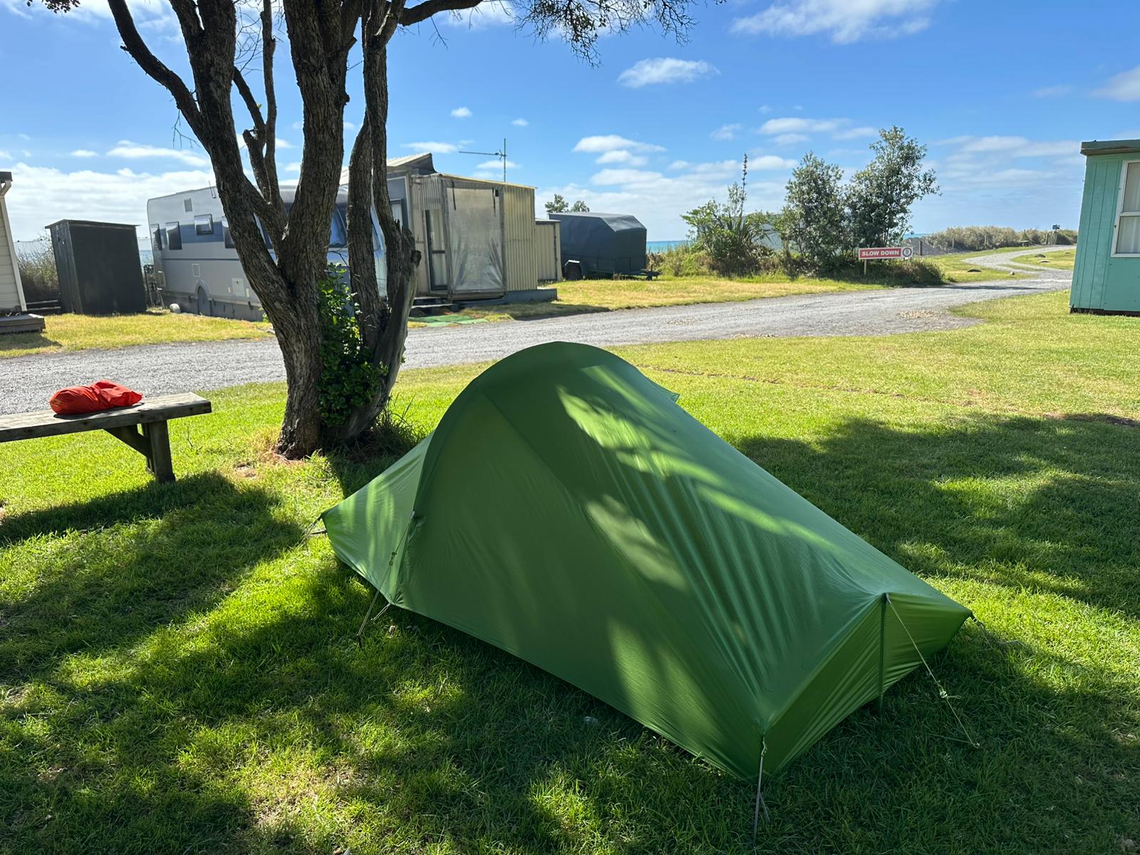 Endlich näherte sich mein Zeltplatz hinter dem Monument (Das Kaitīeke-Kriegsdenkmal wurde am 22. Januar 1923 enthüllt. Die Gedenkinschrift lautete: Dieses Denkmal wurde von den Siedlern von Kaitieke errichtet in Erinnerung an diejenigen, die ihr Leben gaben im Großen Europäischen Krieg 1914 - 1918. Die Namen von 23 einheimischen Männern sind aufgelistet), wo die Trailangel ihr Haus haben. Eine Garage dient als Anlaufstelle: mit Kühlschränken, Wasserkocher, Kaffeemaschine und Kleinigkeiten zum Kaufen, sogar Eis. Roger empfing mich und erzählte ohne Unterbrechung, worauf ich aber vorbereitet war. Als nette Geste bekam ich ein Badehandtuch und die zweite Nacht würde gratis sein.