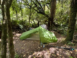 Und dann erblickte ich den Fluss, den Whanganui. Kurz davor gab es links und rechts die Möglichkeit, das Zelt aufzustellen. Wir entschieden uns für die rechte Seite. Falls Guido, der Schnarcher, noch kommen sollte, könnte er auf die andere Seite gehen und niemanden stören. Ich nutzte die Gelegenheit, um mein Zelt zu trocknen, und saß derweil am Fluss. Es war wunderbar ruhig, und die Sonne schien noch.
