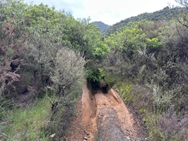 Mitten in meiner Morgenbegeisterung – der Dunst über den Bergen, der schöne Fluss – passierte es: Als ich ein Foto machen wollte, überprüfte ich kurz die Trail-App und stellte fest, dass ich falsch abgebogen war! Es war nicht allzu weit, aber ärgerlich. Kurze Zeit später kam mir auch Gorden entgegen. Wir hatten beide die Markierungen gesehen, aber sie lagen am Boden, da der Baum, an dem sie befestigt waren, umgestürzt war und wir hatten angenommen, dass wir trotzdem richtig waren. Egal, wenig später war ich wieder auf dem richtigen Weg.